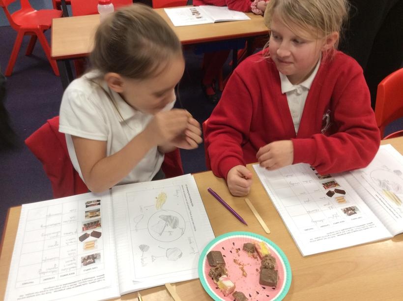We have observed and analysed cakes and chocolates to investigate if they resemble rocks which are sedimentary - have bits of rock merged together, metamorphic - layers of rock squashed down or changed by heat or igneous rocks which have been melted and are pitted with air holes.