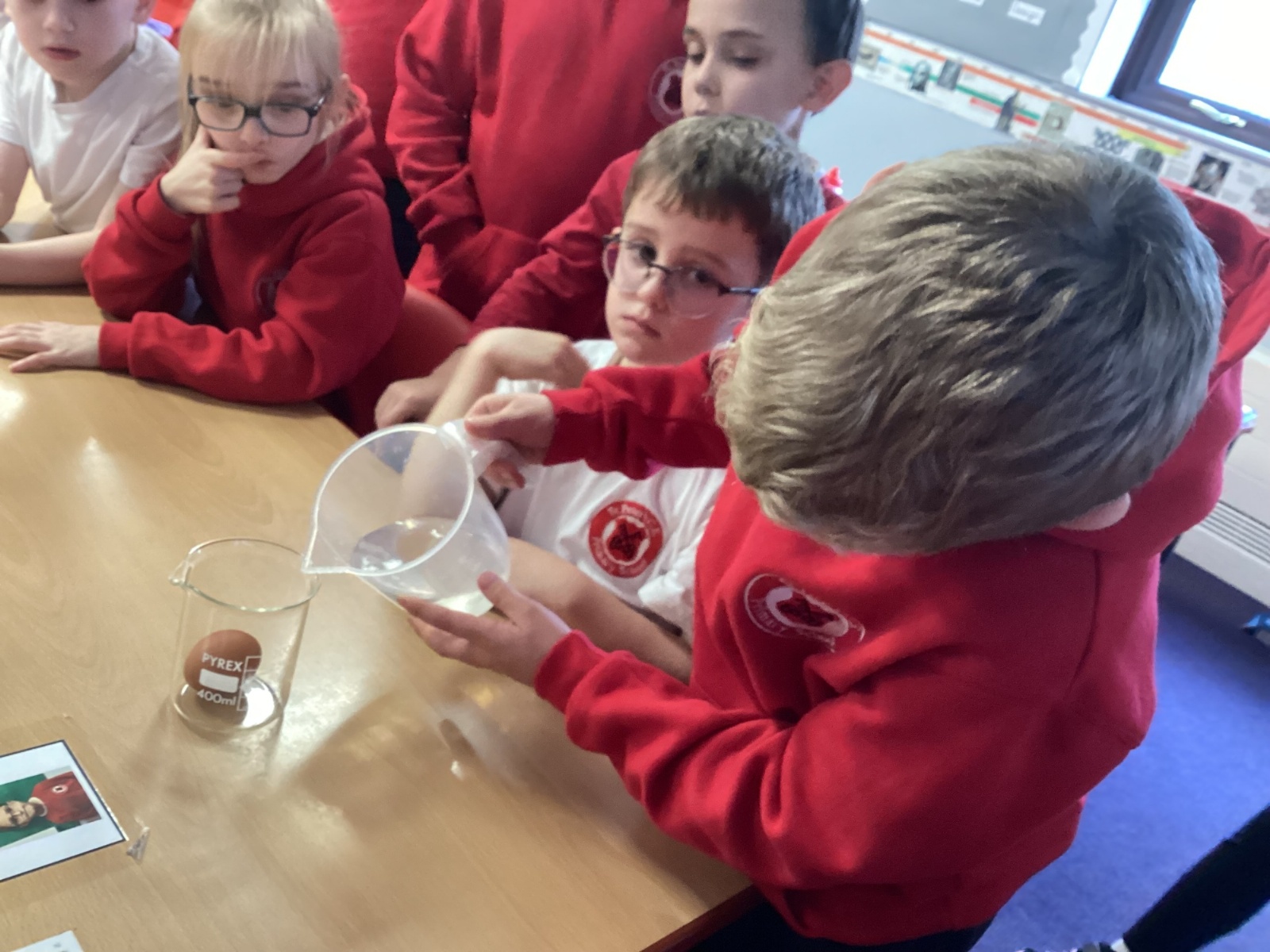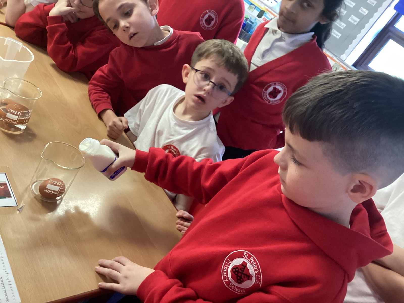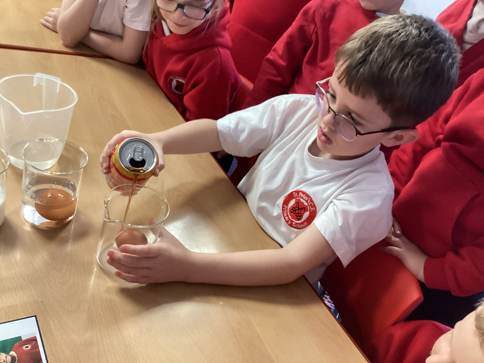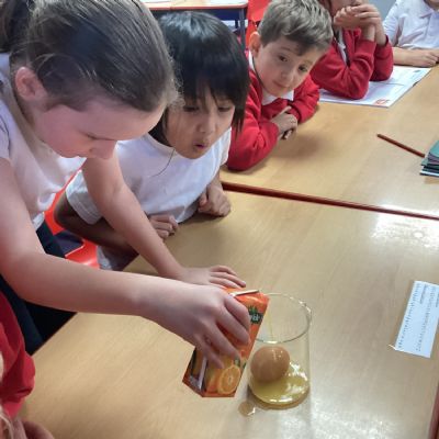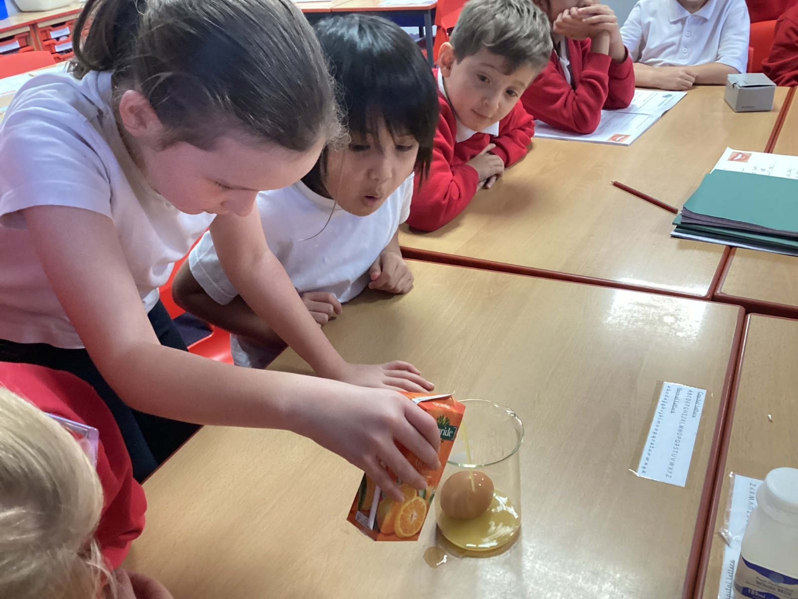 Today we investigated the question “Which liquid does the least damage to eggshells?” We learnt that the shell protects the egg a bit like the enamel on our tooth protects the living part inside.