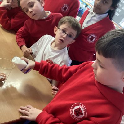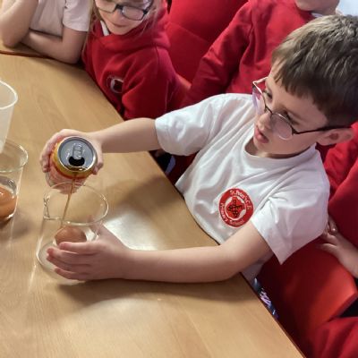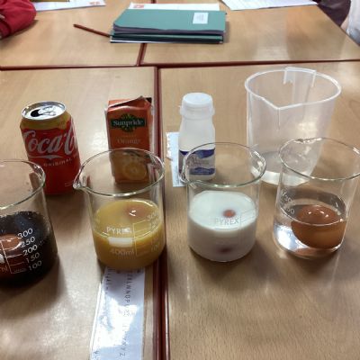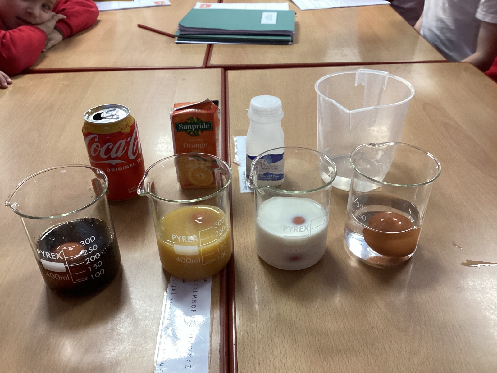 We chose four drinks that we were going to use. We then discussed how we were going to make the test fair; by using the same amount of liquid and by keeping the eggs in the liquid for the same amount of time. We are going to observe the results over the next four days.