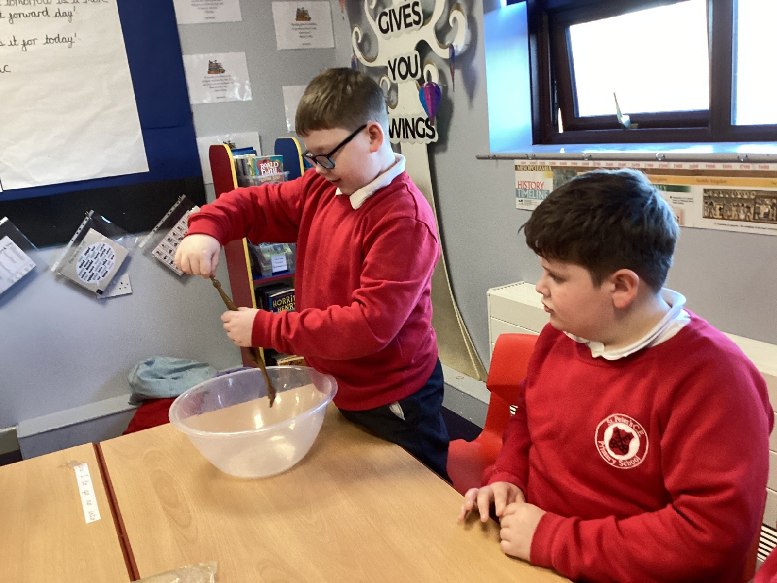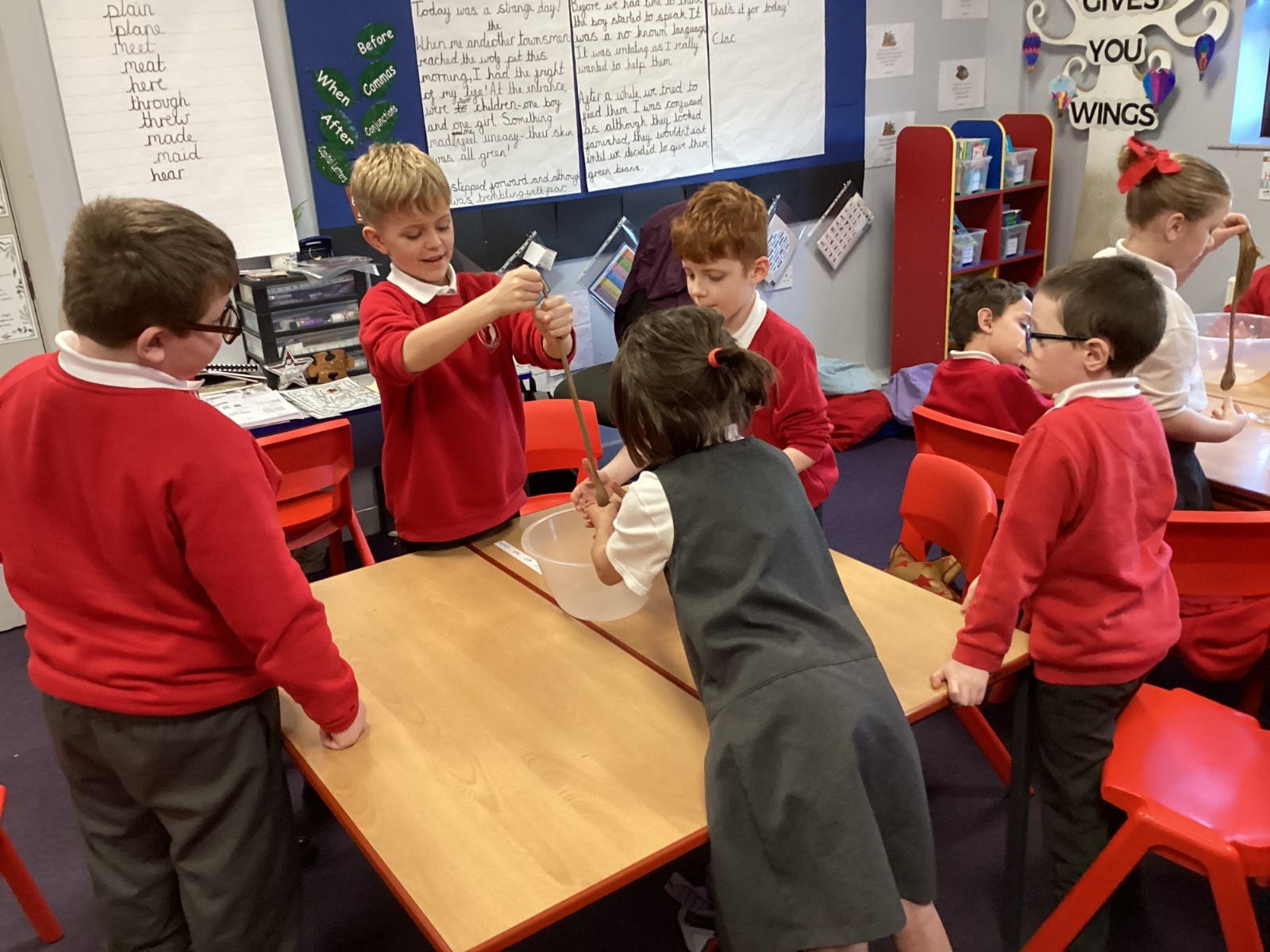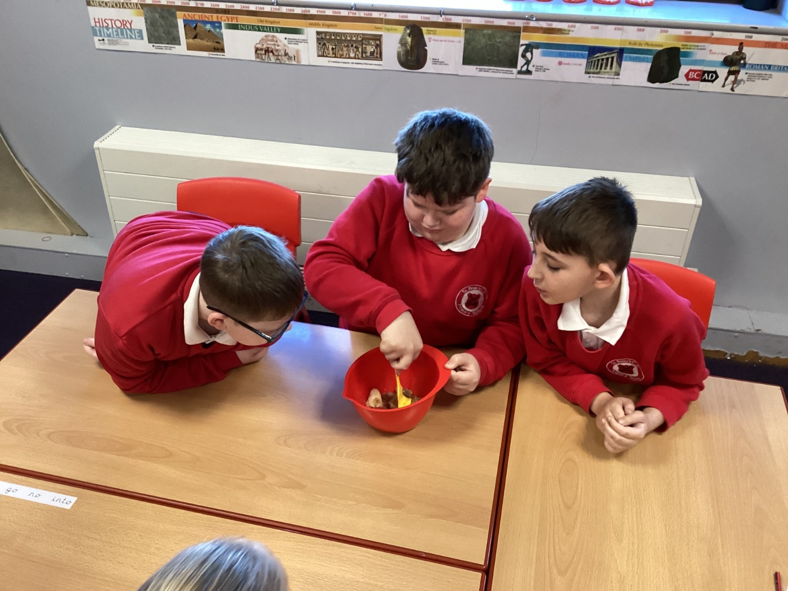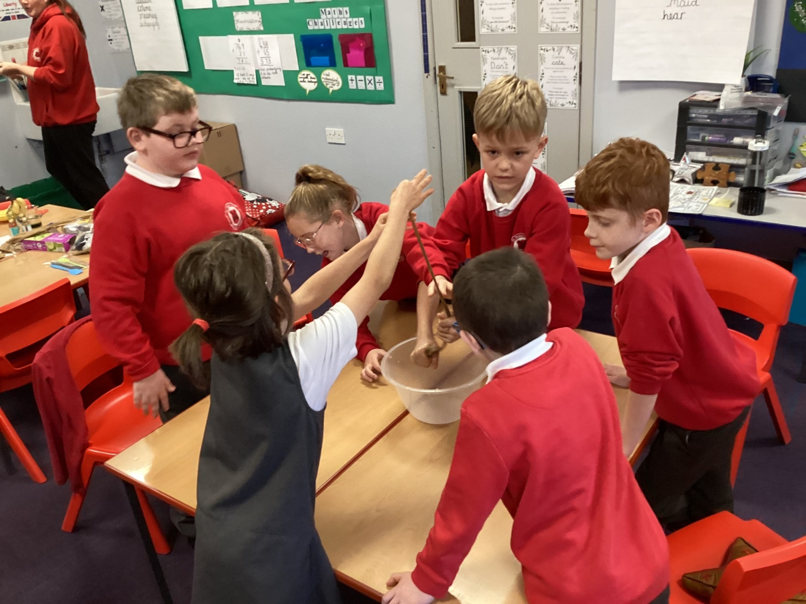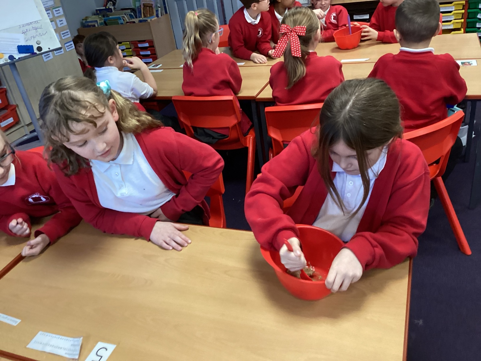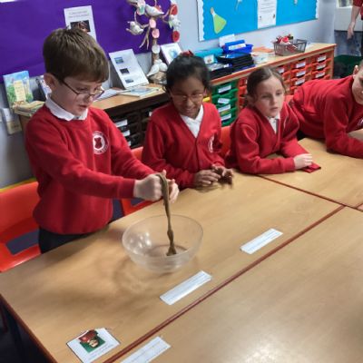 We began by placing half a banana and a Weetabix into a bowl to represent the mouth. Using a spatula as our “teeth,” the children broke the food into smaller pieces. We added water to act as saliva and continued mashing the mixture, just as our teeth and saliva do in real life.