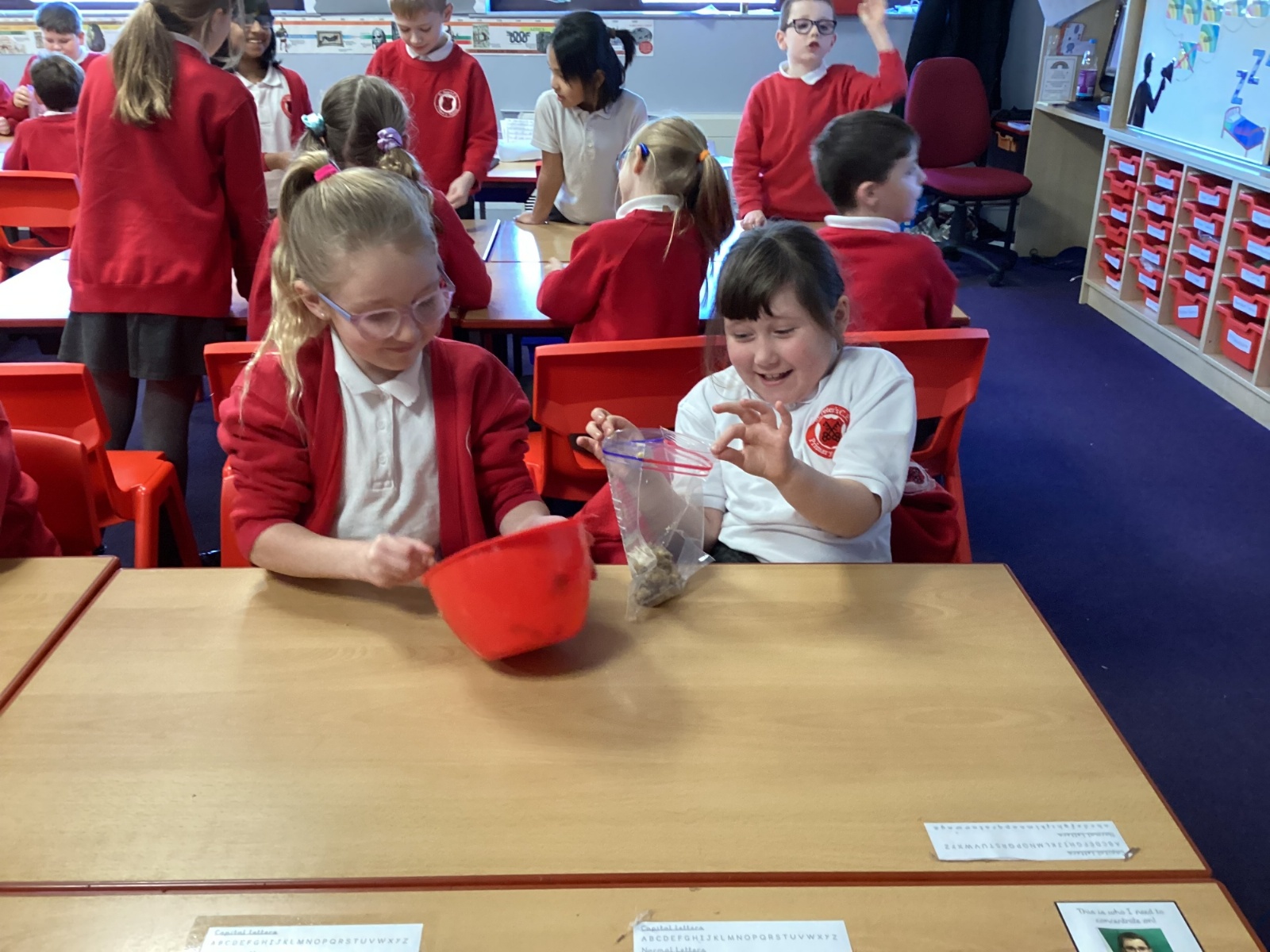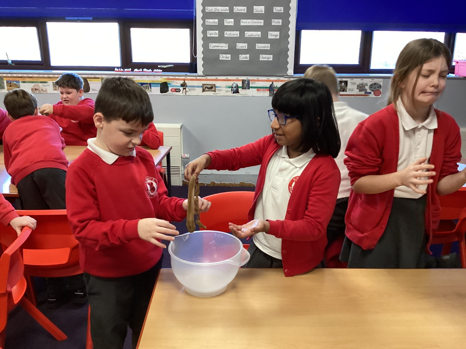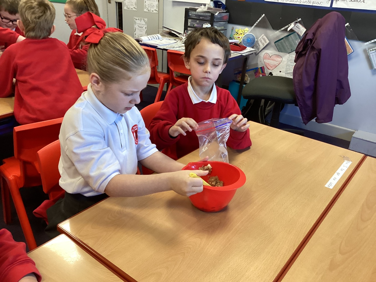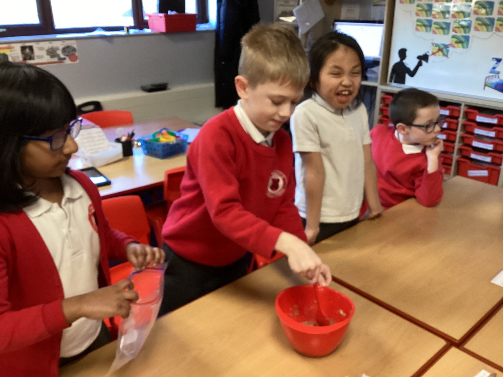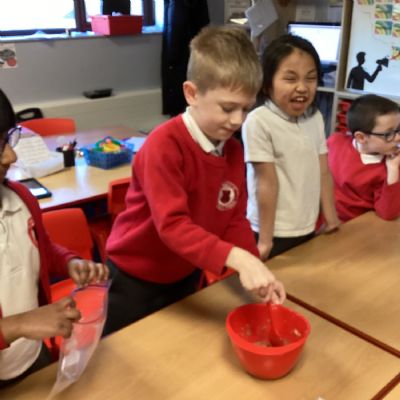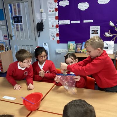 From there, we moved the mixture into a larger bag to model the stomach. We added coloured water to represent stomach acid, which helps break food down even further. The children then “squeezed” the stomach to show how it churns and mixes food. At this stage, we also talked about how enzymes from other organs—such as the liver—enter to support digestion.