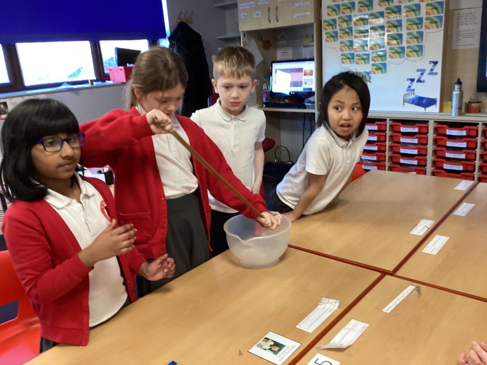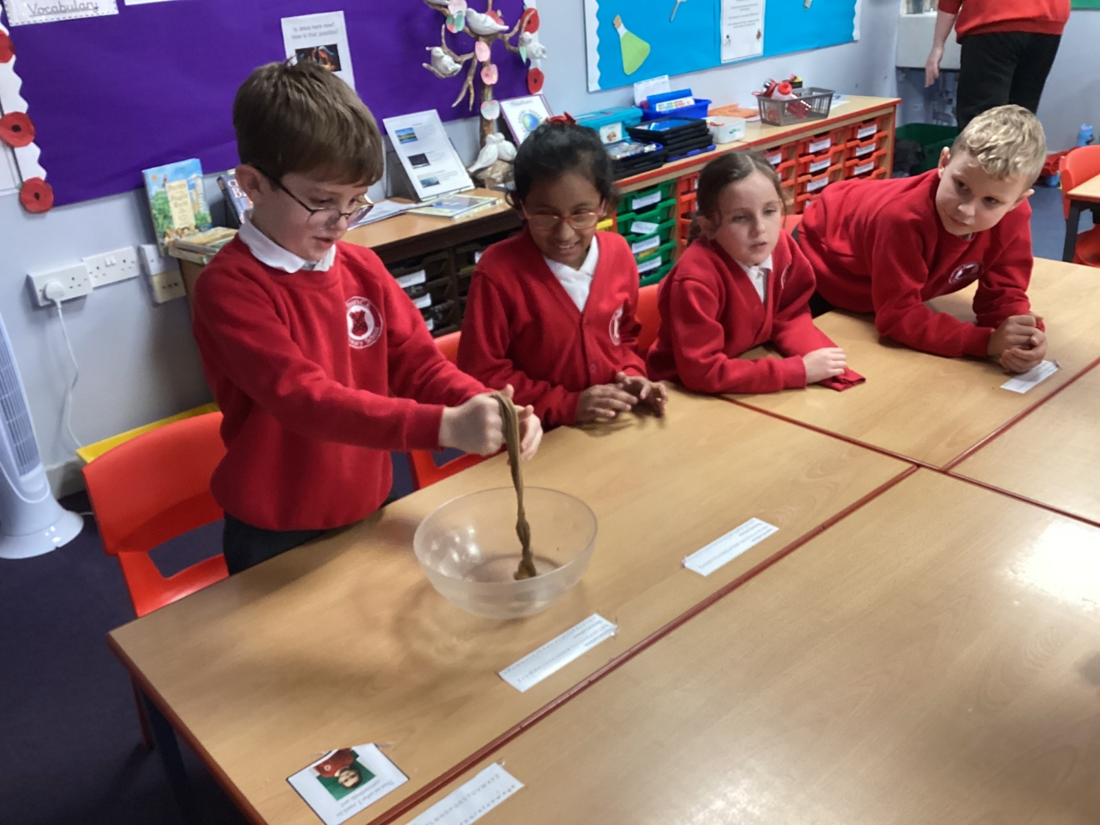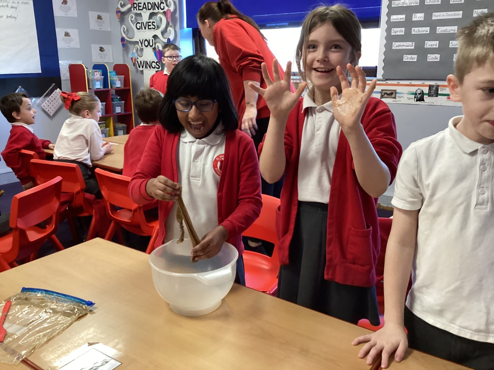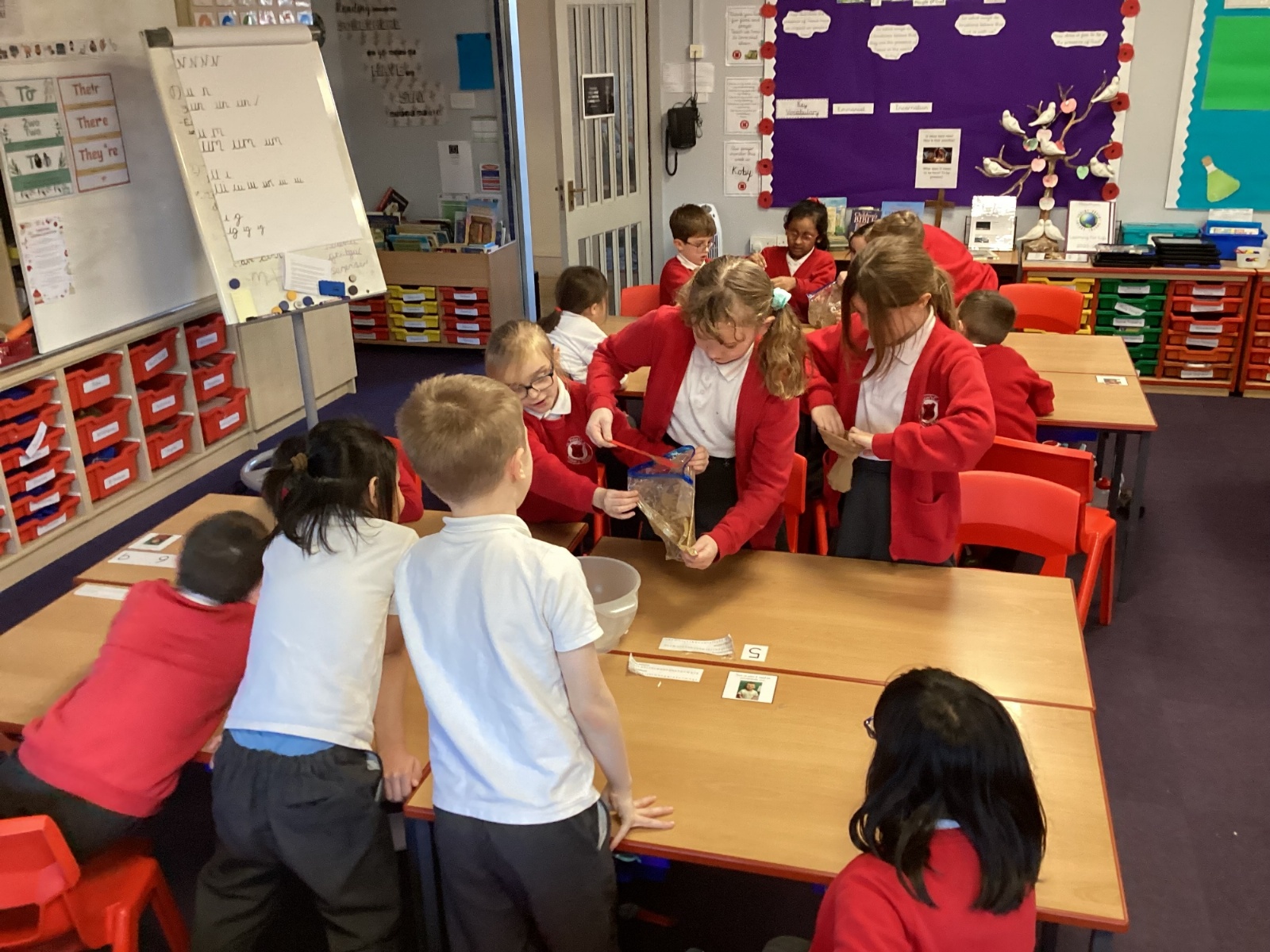 From there, we moved the mixture into a larger bag to model the stomach. We added coloured water to represent stomach acid, which helps break food down even further. The children then “squeezed” the stomach to show how it churns and mixes food. At this stage, we also talked about how enzymes from other organs—such as the liver—enter to support digestion.