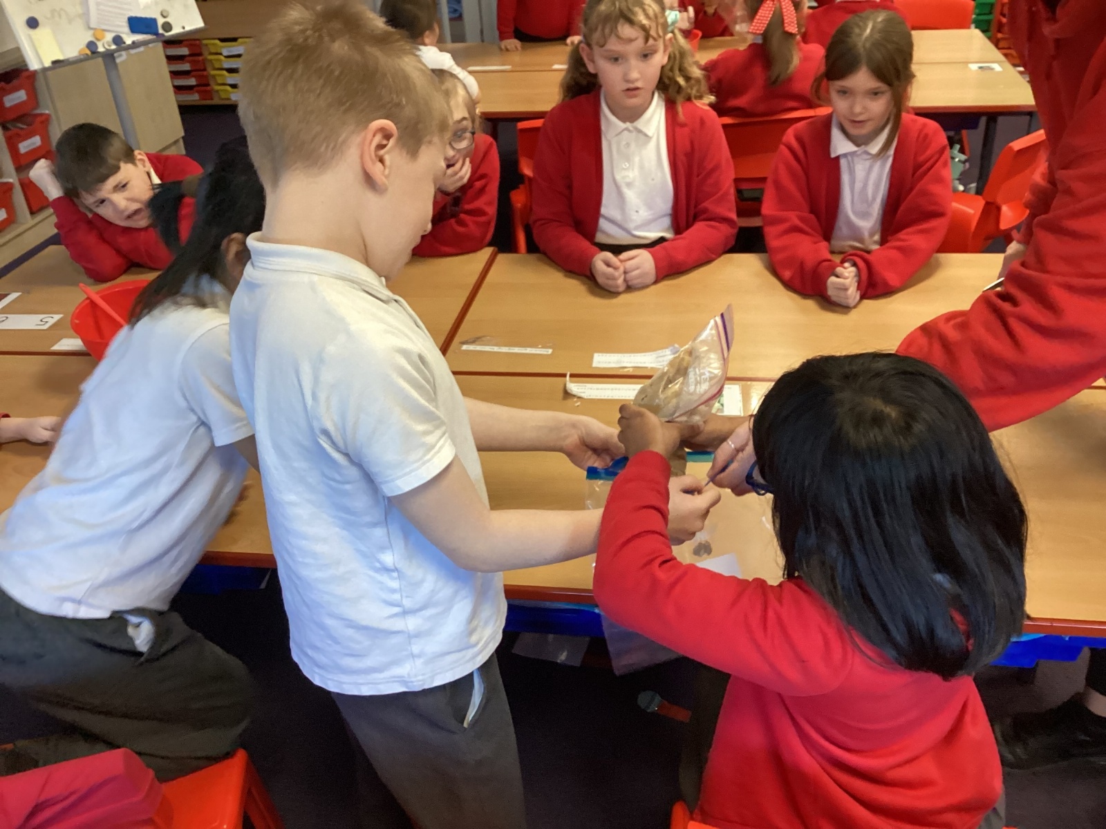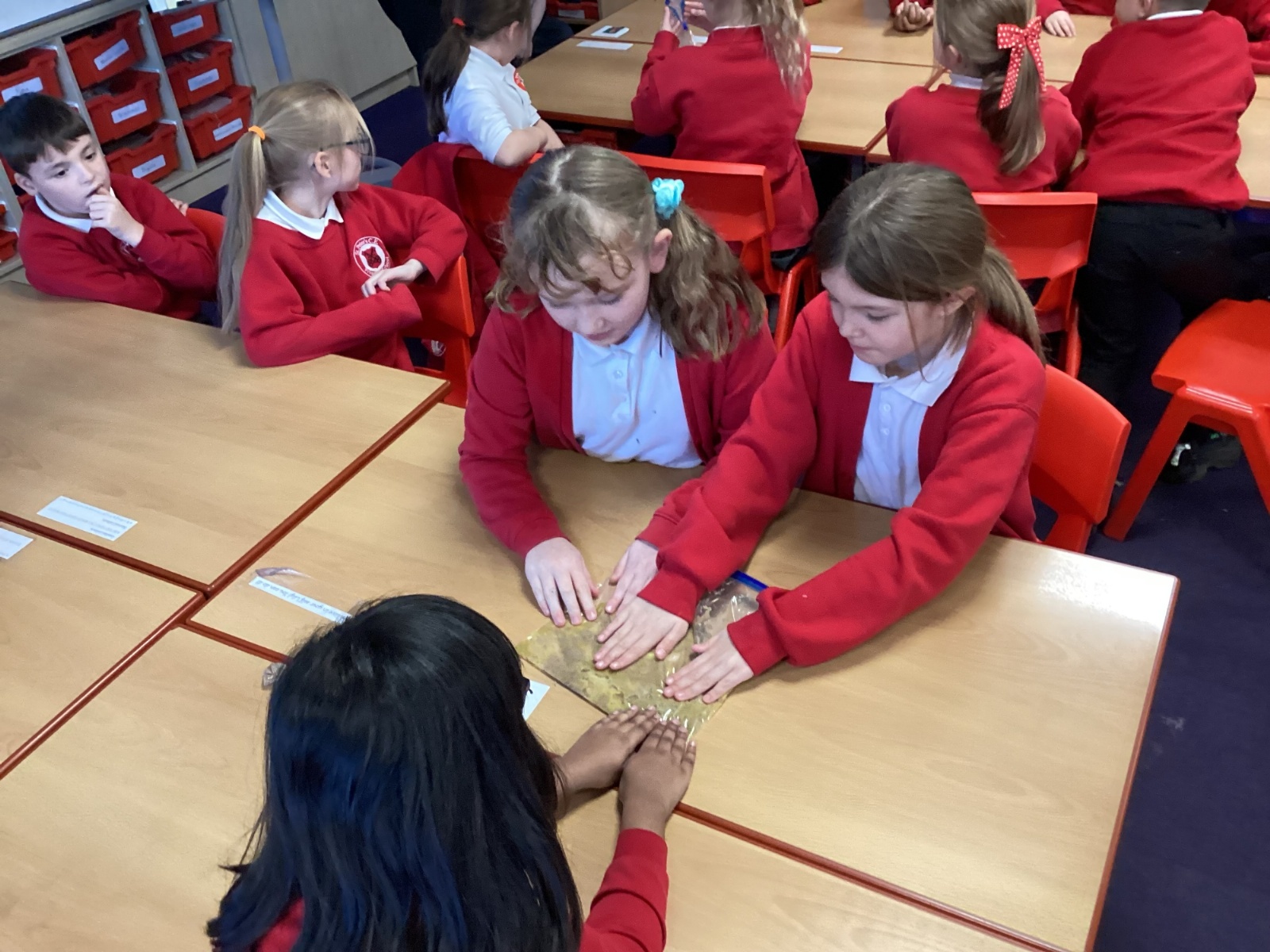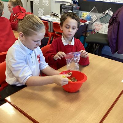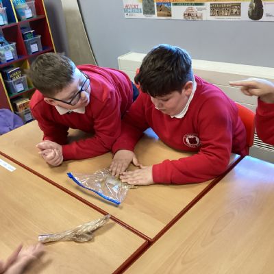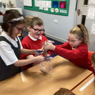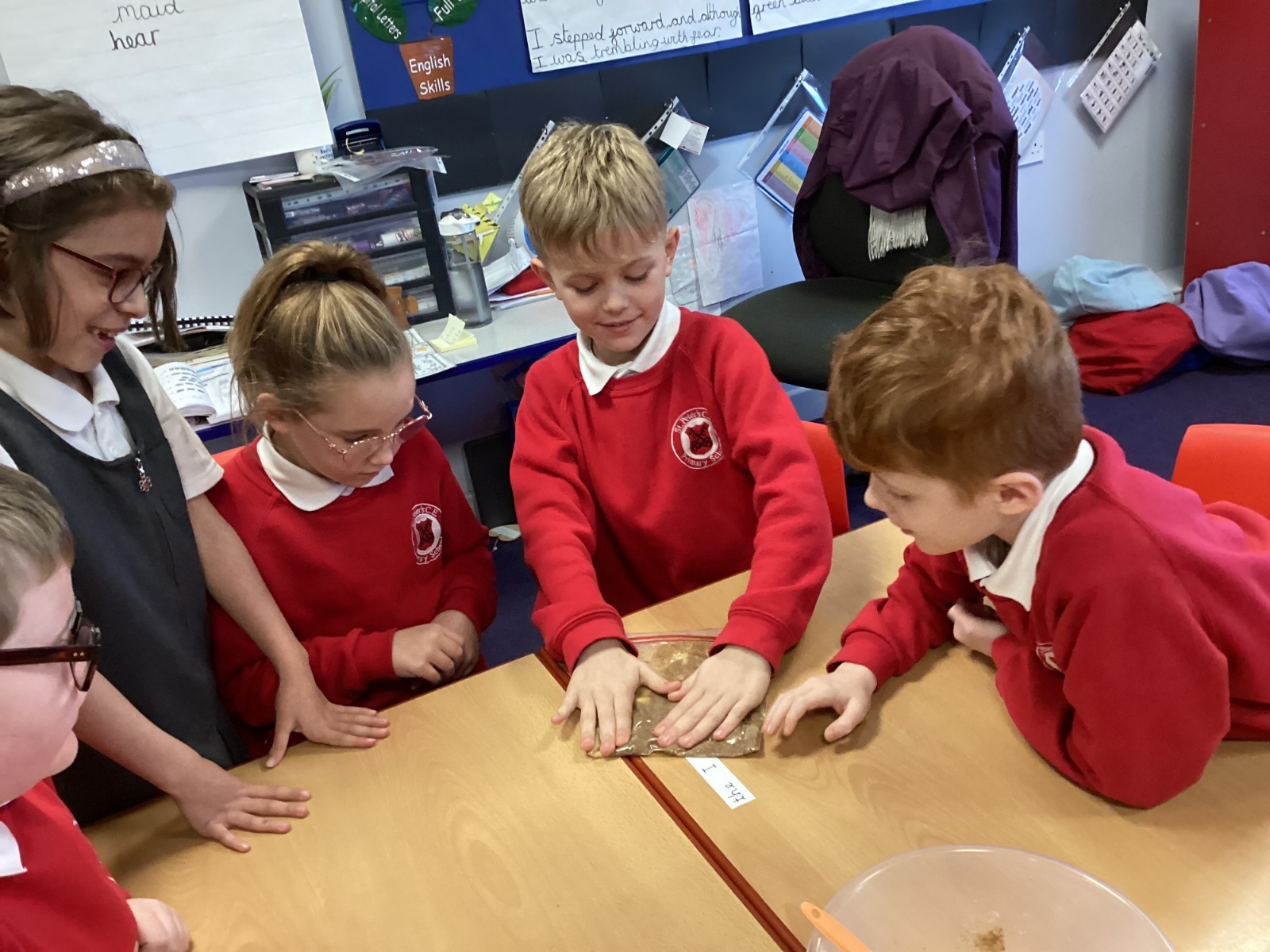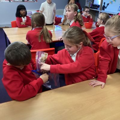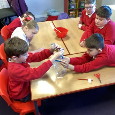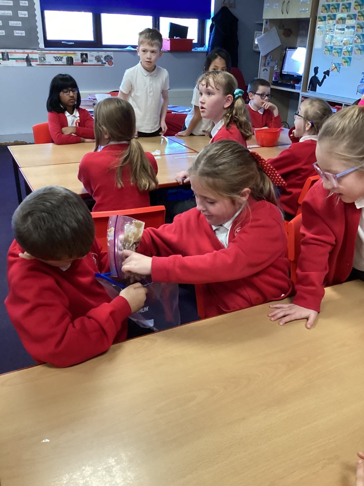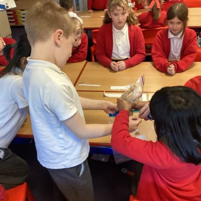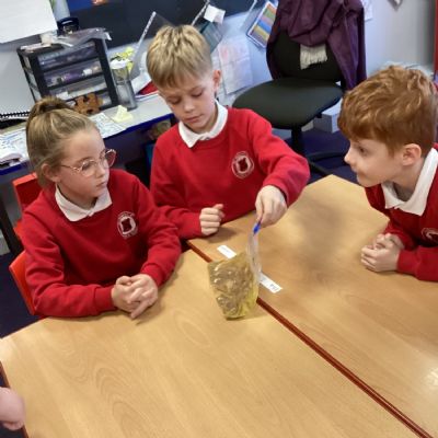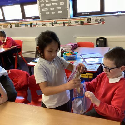 Next, we transferred the food into a small plastic bag to represent the oesophagus. The children gently squeezed the bag to mimic the muscular movements that push food down through this tube.