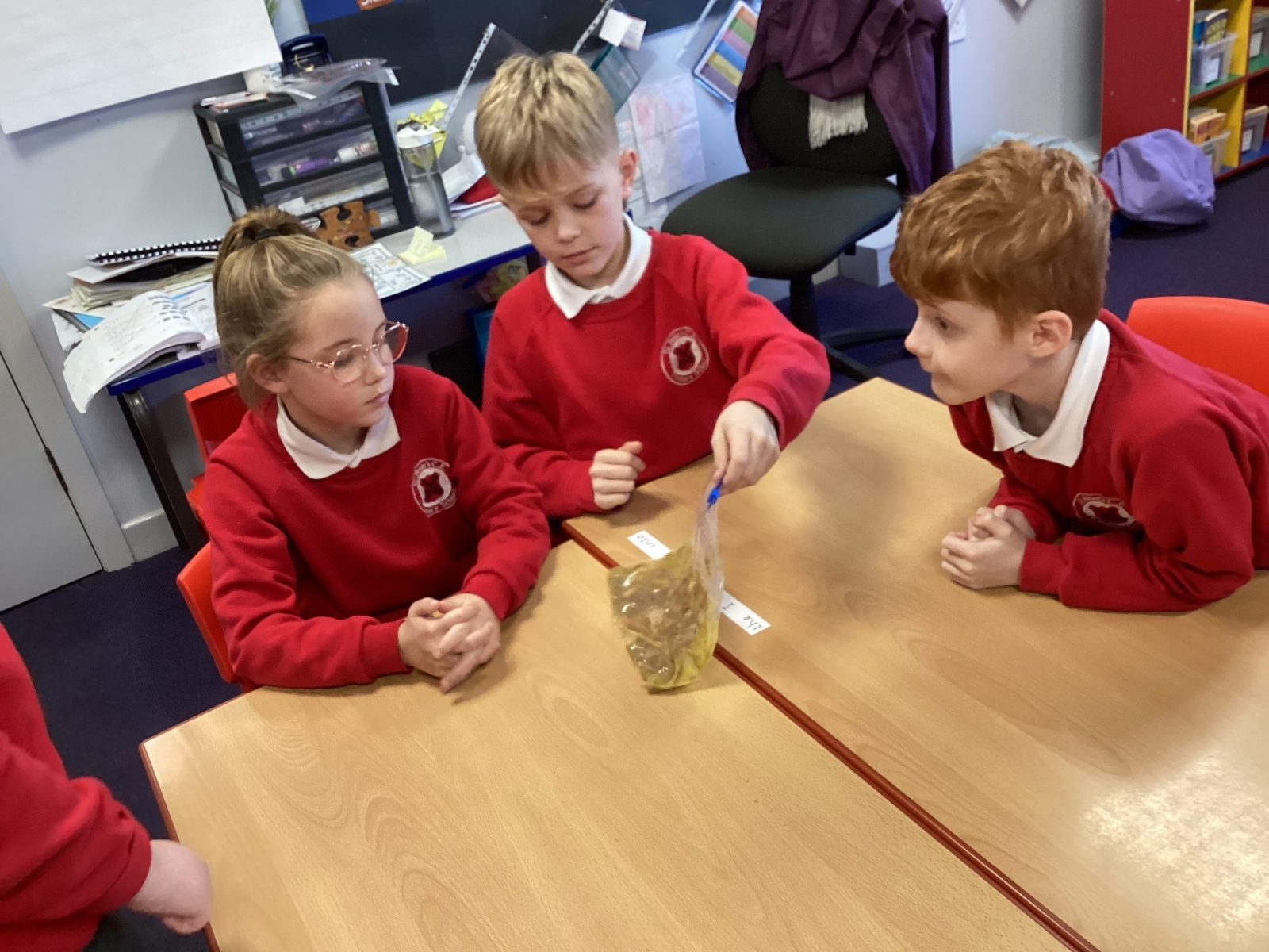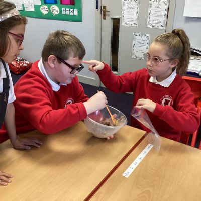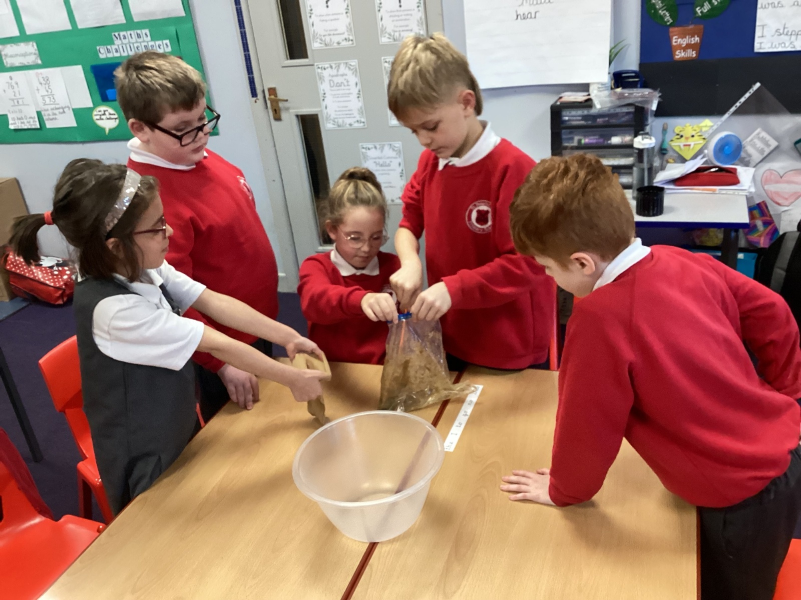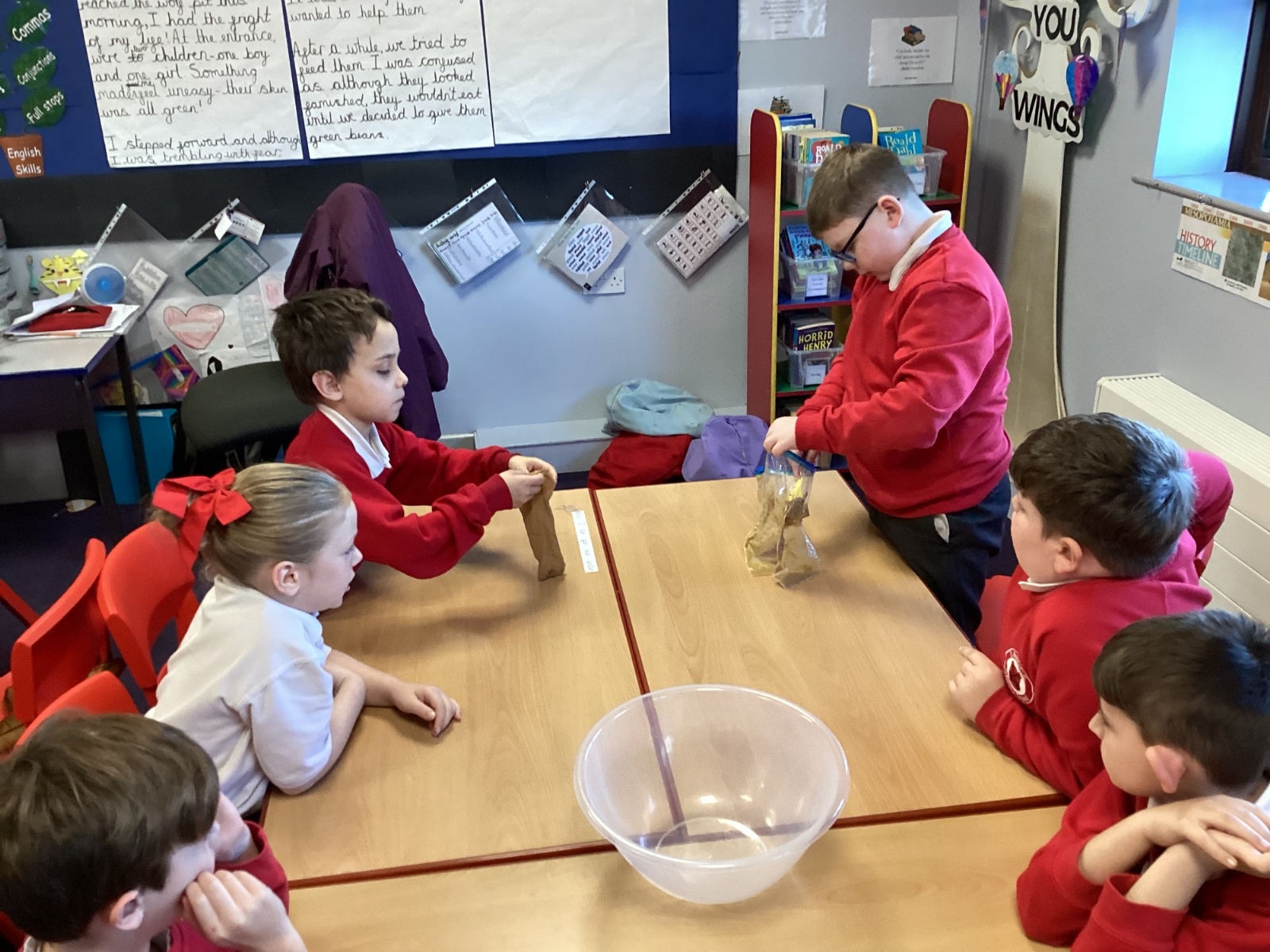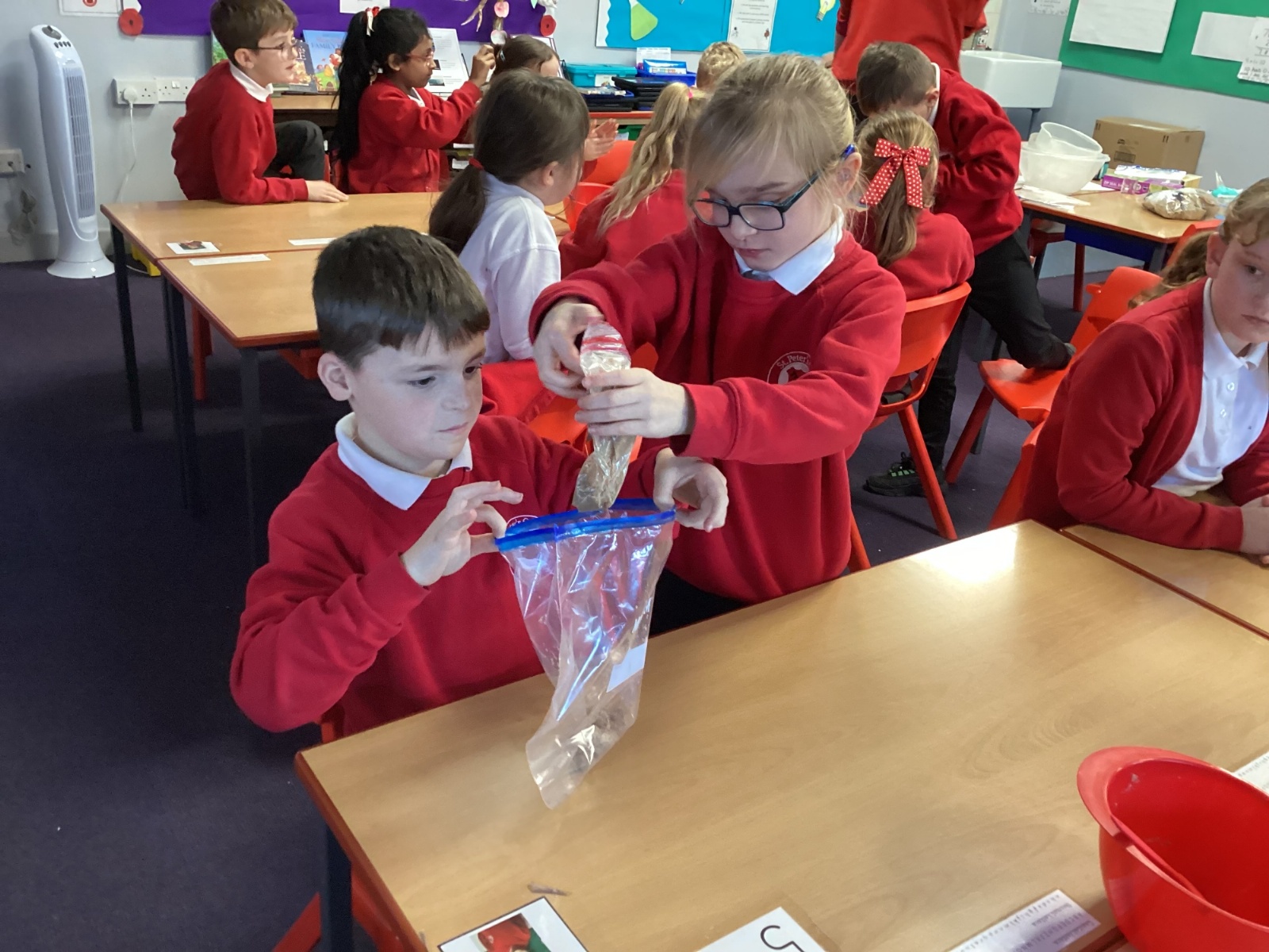 Next, we transferred the food into a small plastic bag to represent the oesophagus. The children gently squeezed the bag to mimic the muscular movements that push food down through this tube.