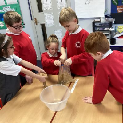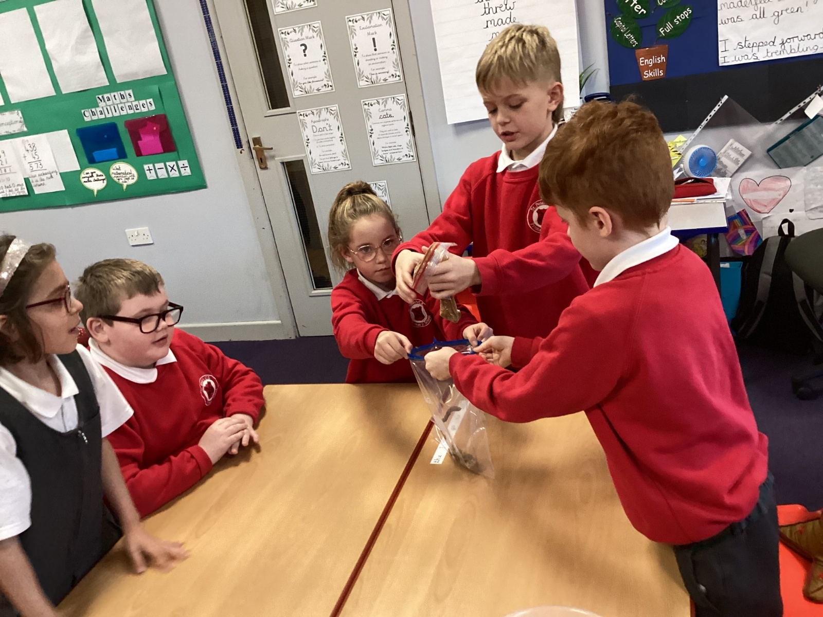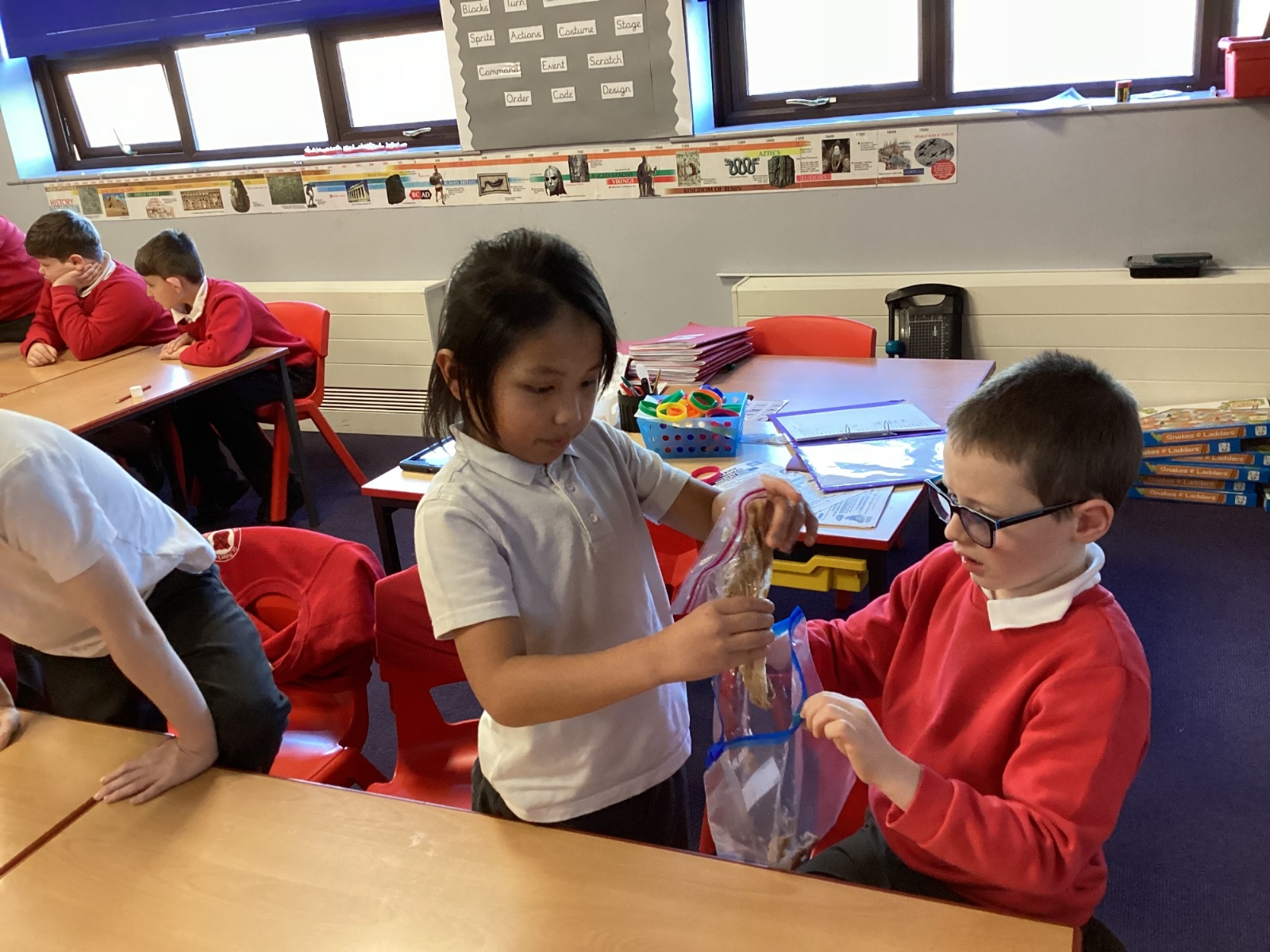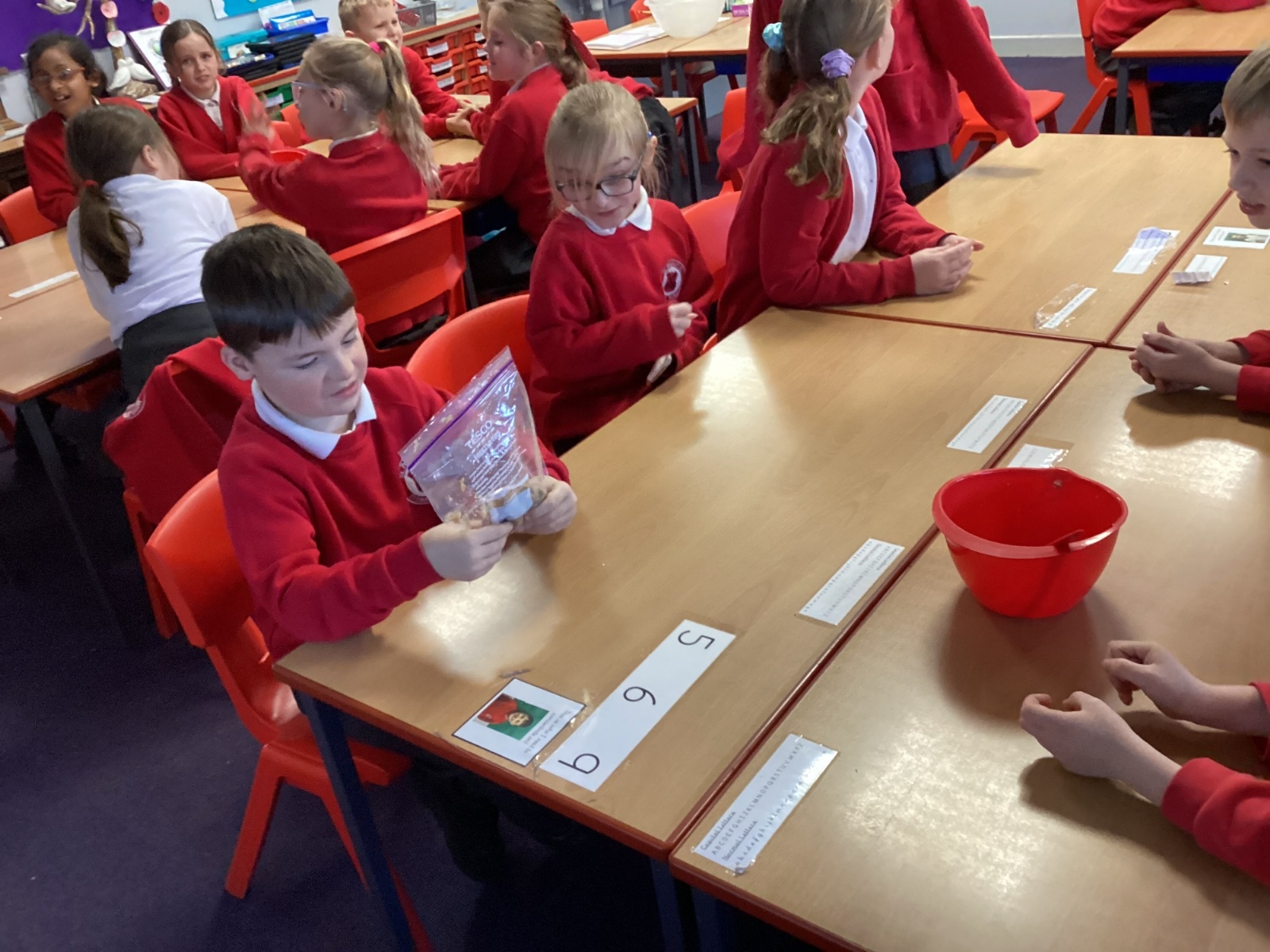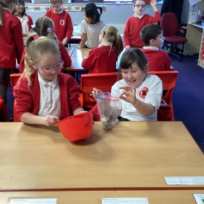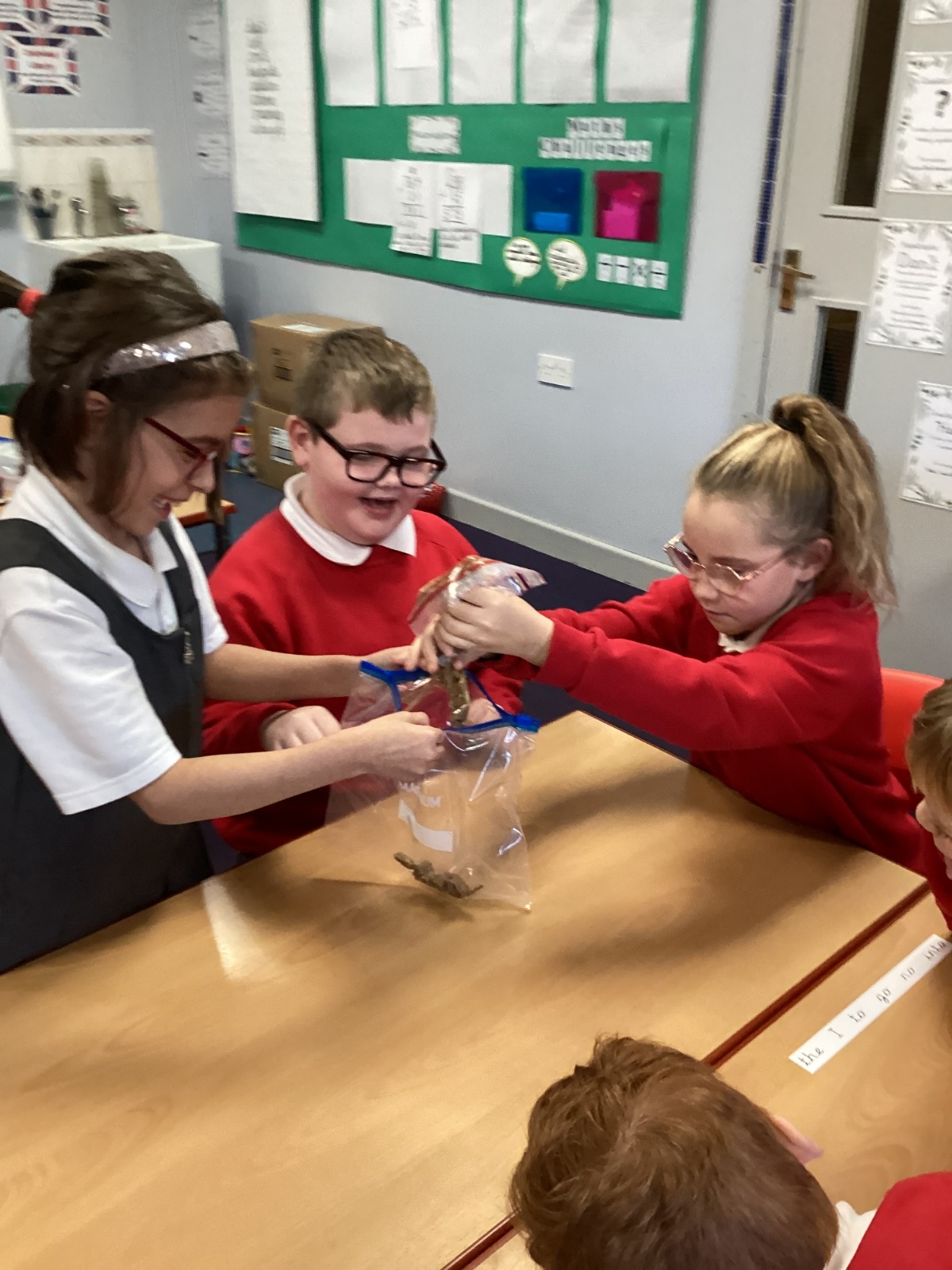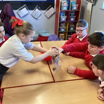 Next, we transferred the food into a small plastic bag to represent the oesophagus. The children gently squeezed the bag to mimic the muscular movements that push food down through this tube.
