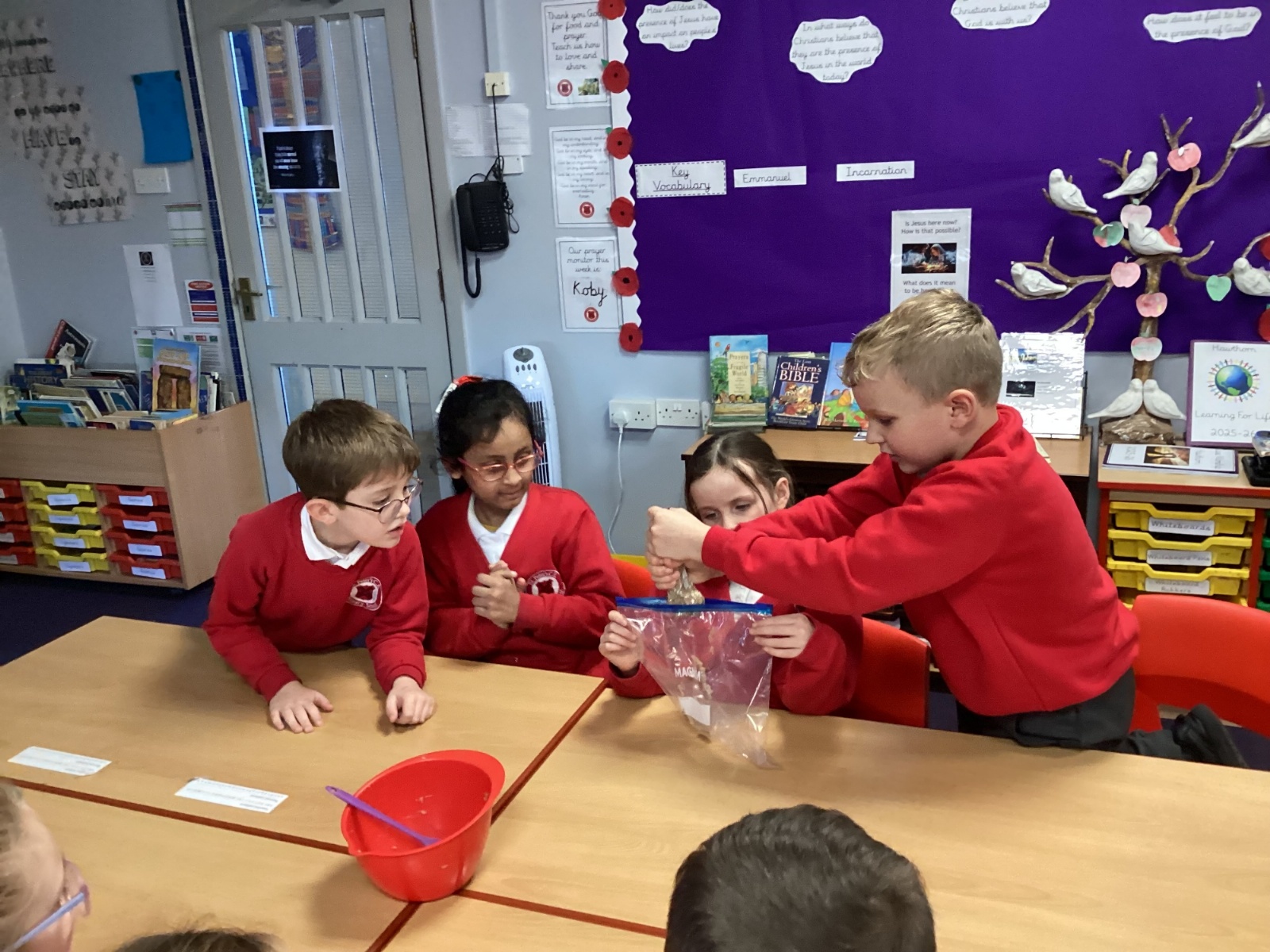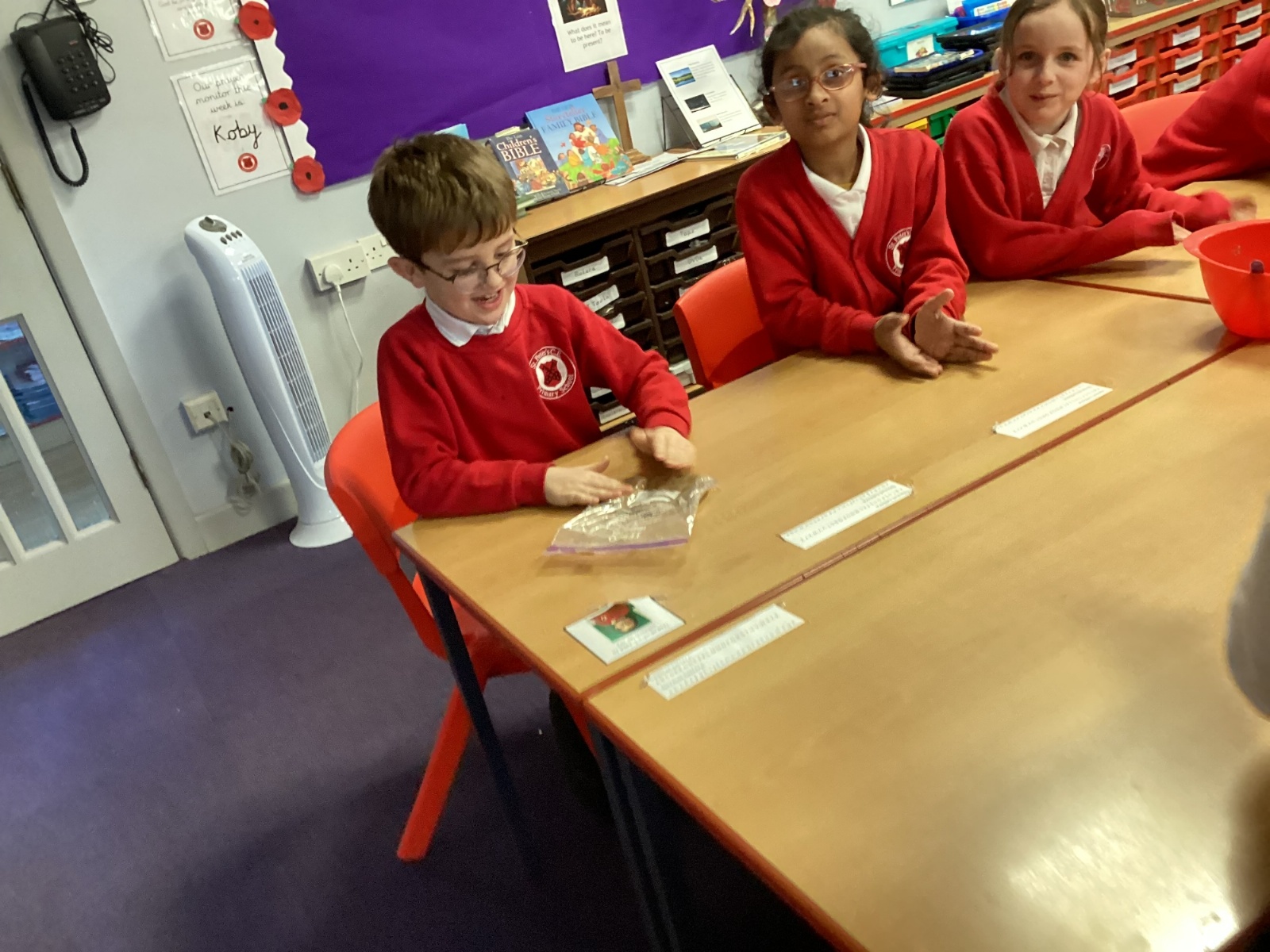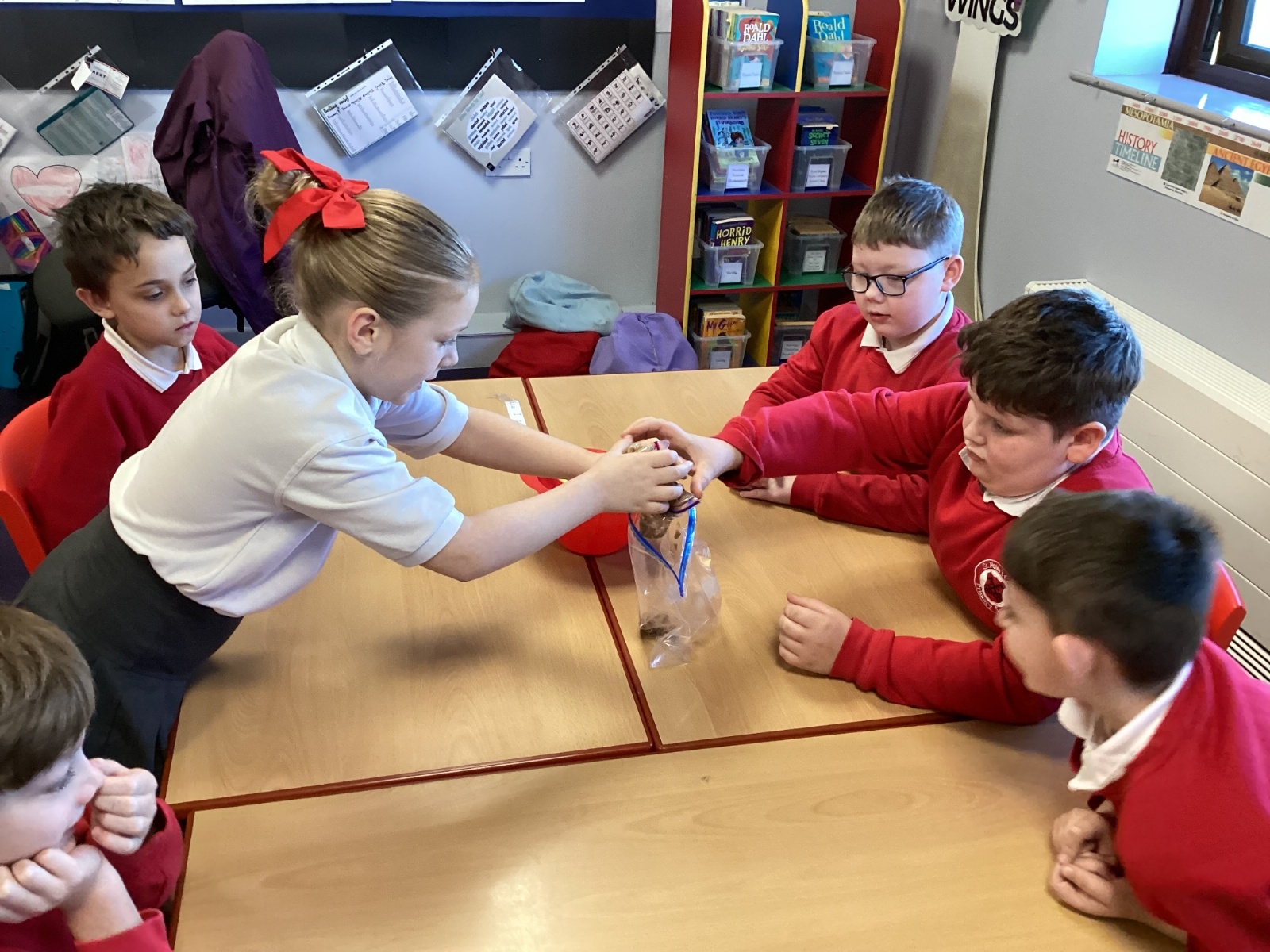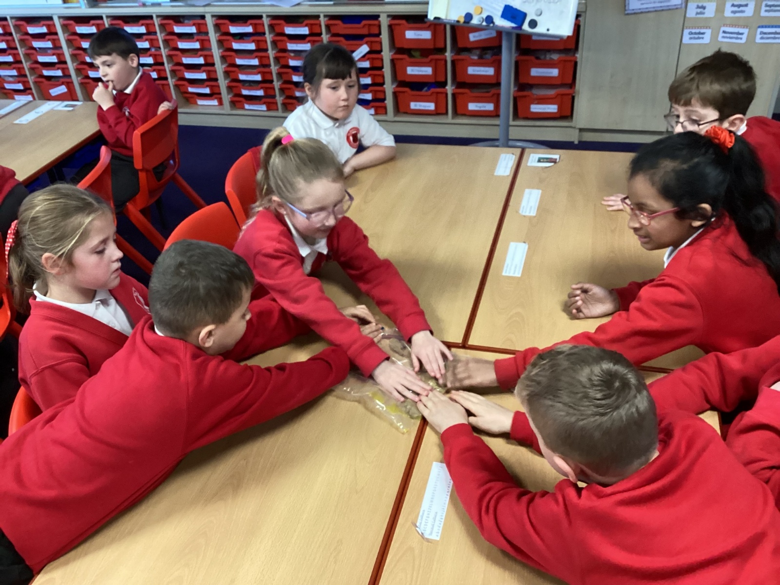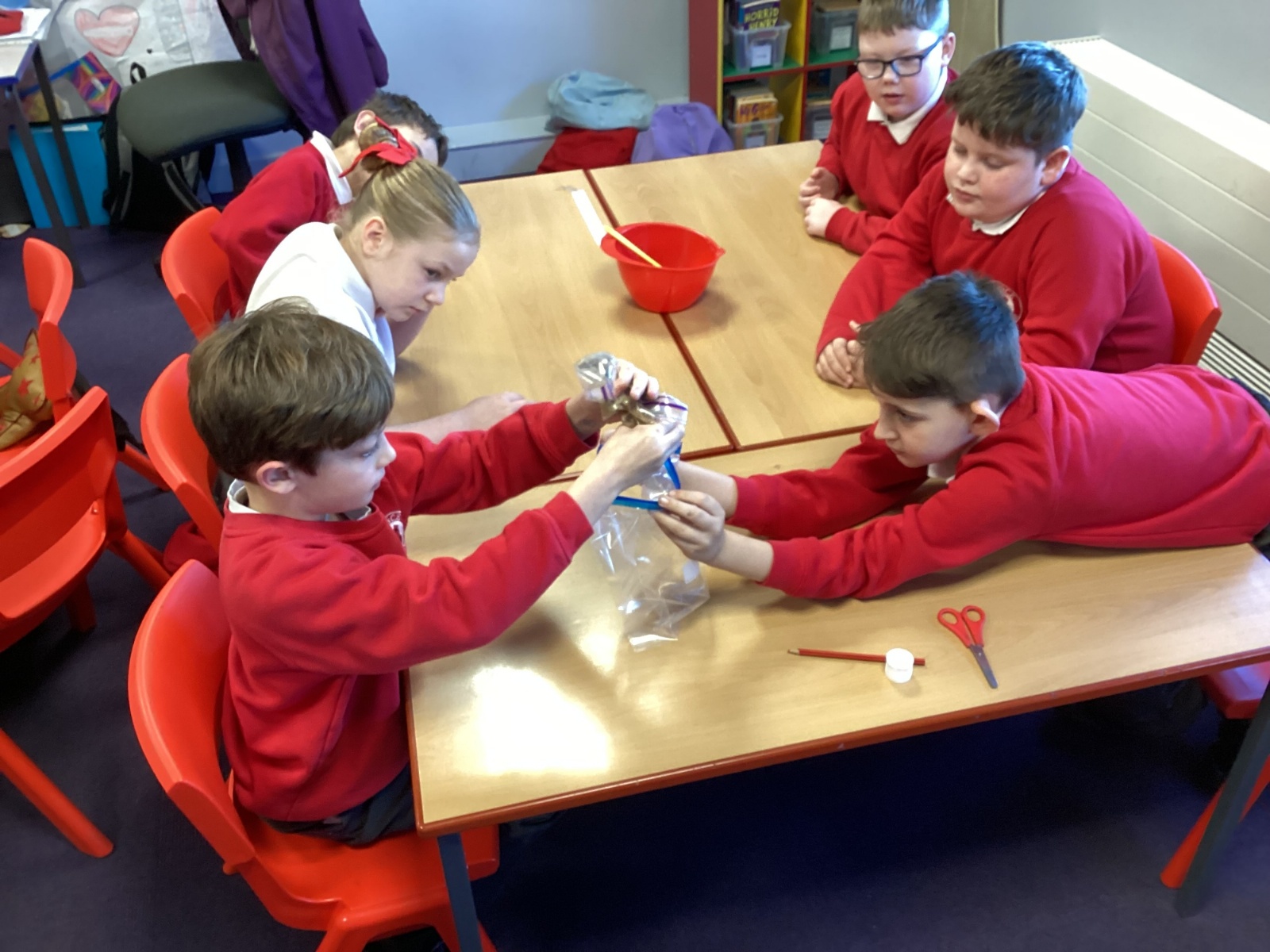Next, we transferred the food into a small plastic bag to represent the oesophagus. The children gently squeezed the bag to mimic the muscular movements that push food down through this tube.