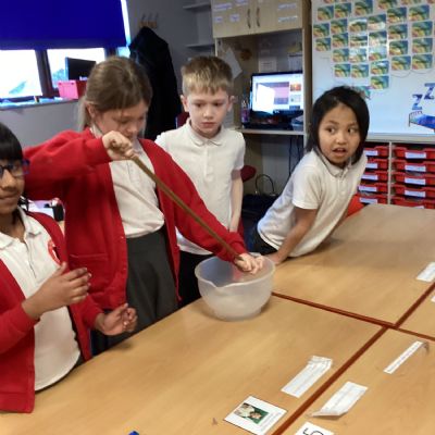 After that, we used tights to represent the intestines. We added green and red coloured water to act as bile and pancreatic juices. As the children squeezed the tights, they noticed the liquid passing through—demonstrating how nutrients move out of the small intestine and into the bloodstream. Any remaining, undigested material continues its journey and is eventually passed out of the body as waste.