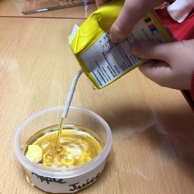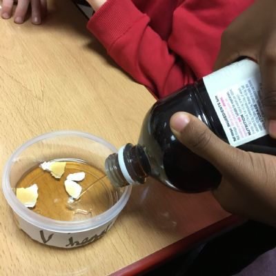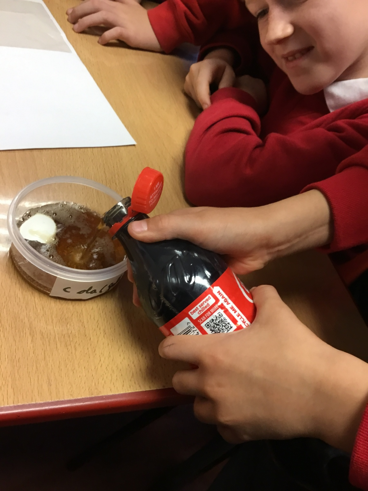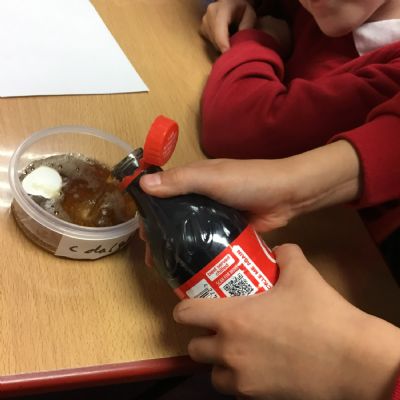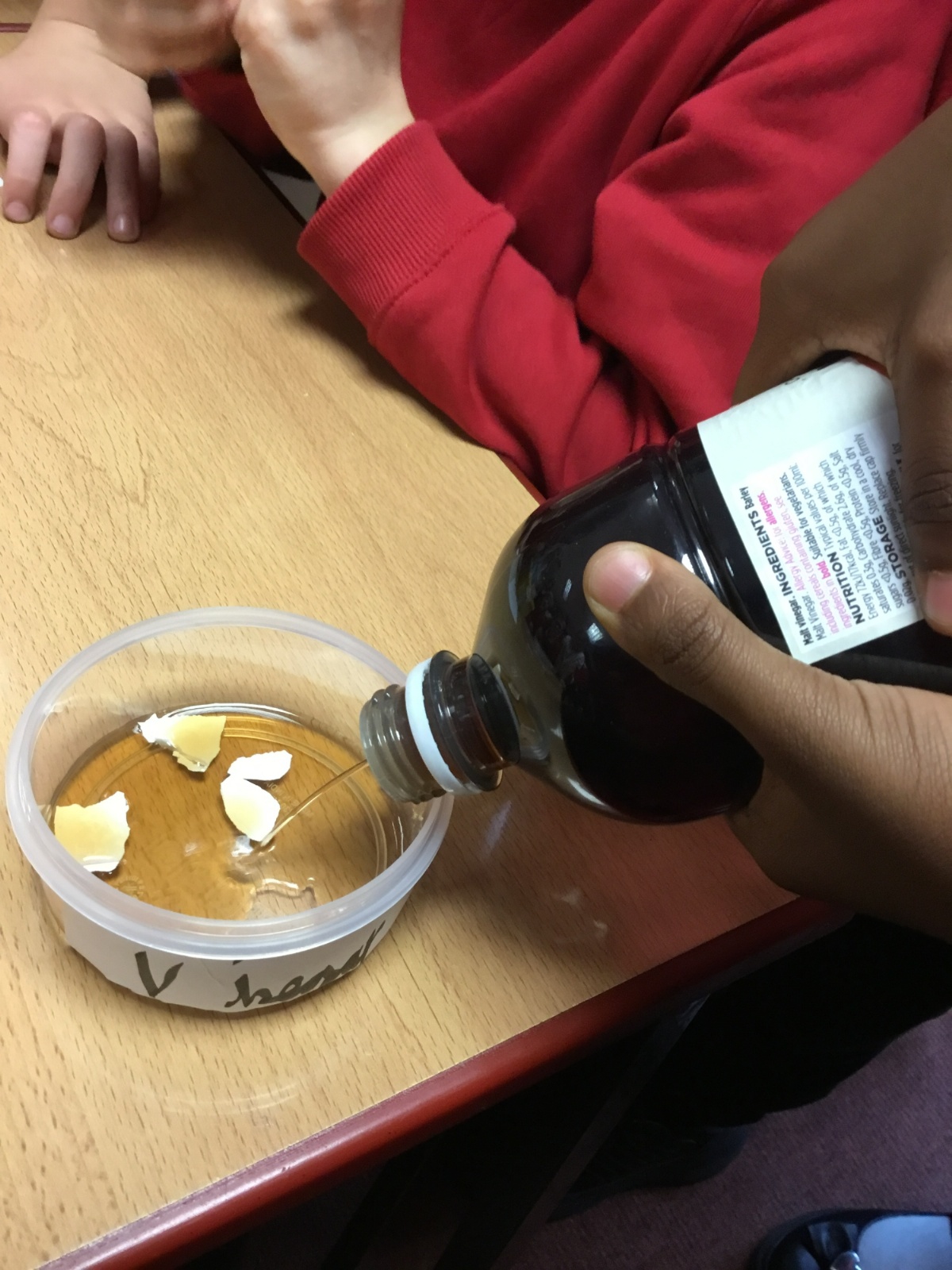 We made predictions about the effects that different liquids might have on our teeth. We used pieces of eggshell to represent the enamel on our teeth. We observed what happened over time.