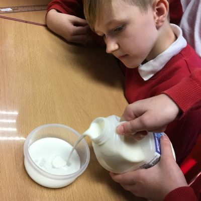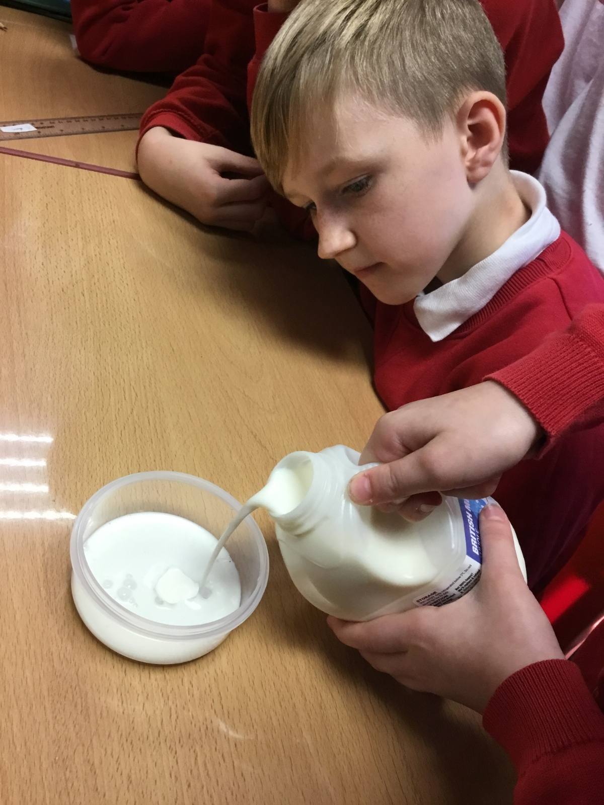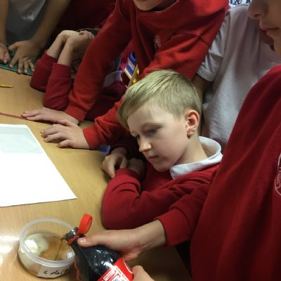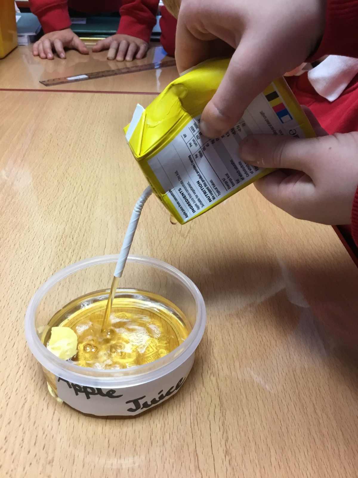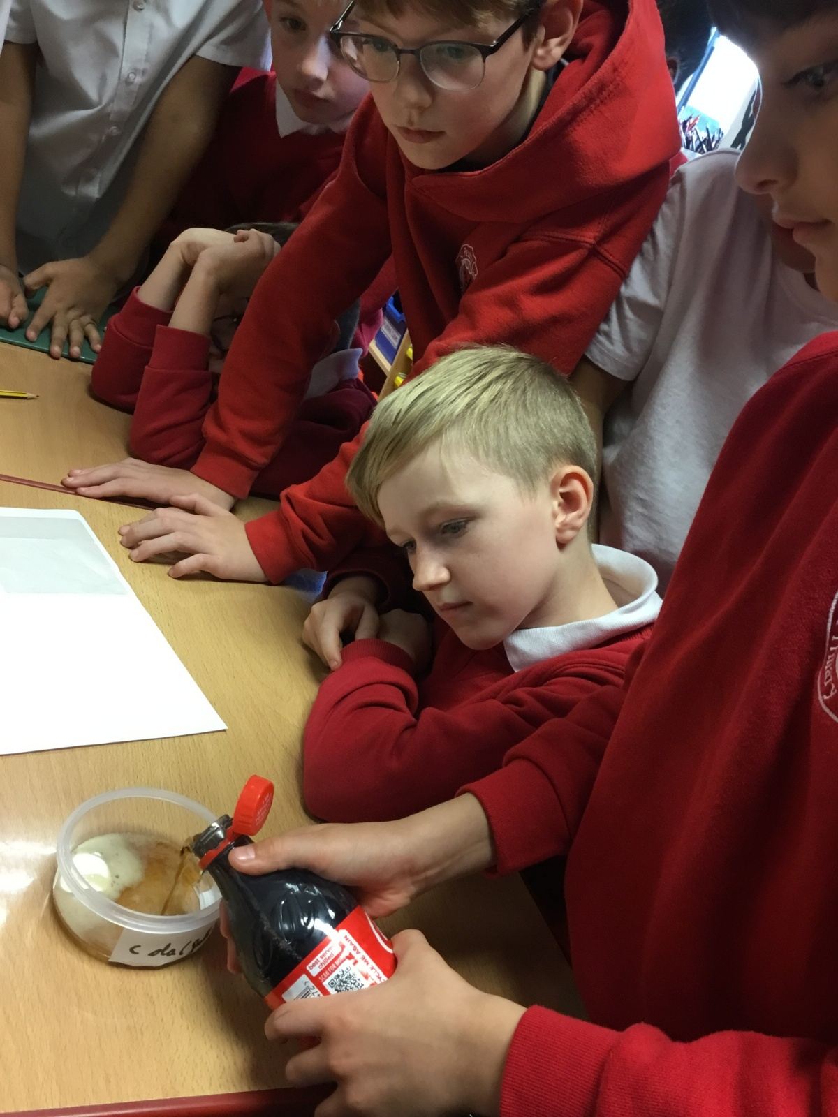 We made predictions about the effects that different liquids might have on our teeth. We used pieces of eggshell to represent the enamel on our teeth. We observed what happened over time.