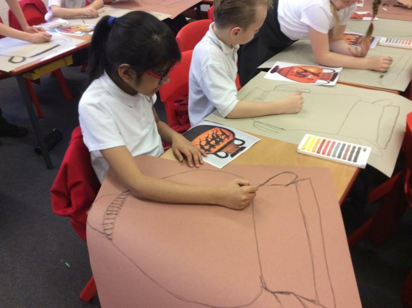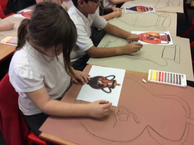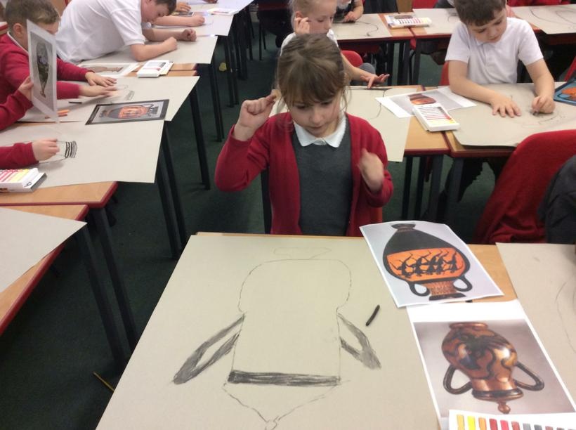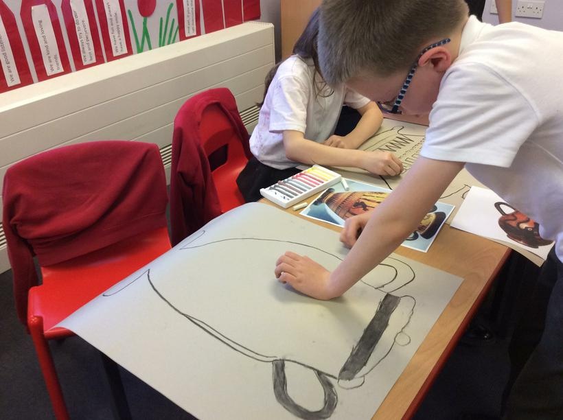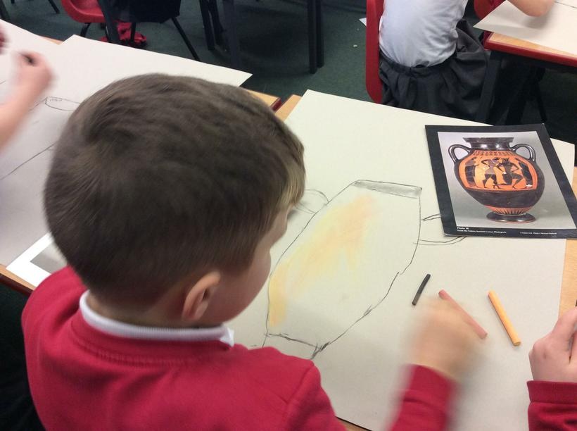 To contribute to our history topic, 'What Have the Greeks Done For Us', Classes 7 and 8 have used charcoal and pastels for these observational drawings of Greek Urns. We have learnt how the pots depict everyday life such as olive picking or illustrate a Greek myth. The challenge was to work individually on a large scale.
