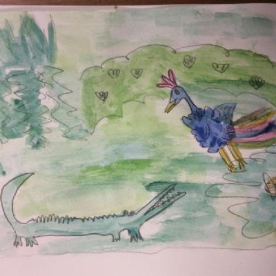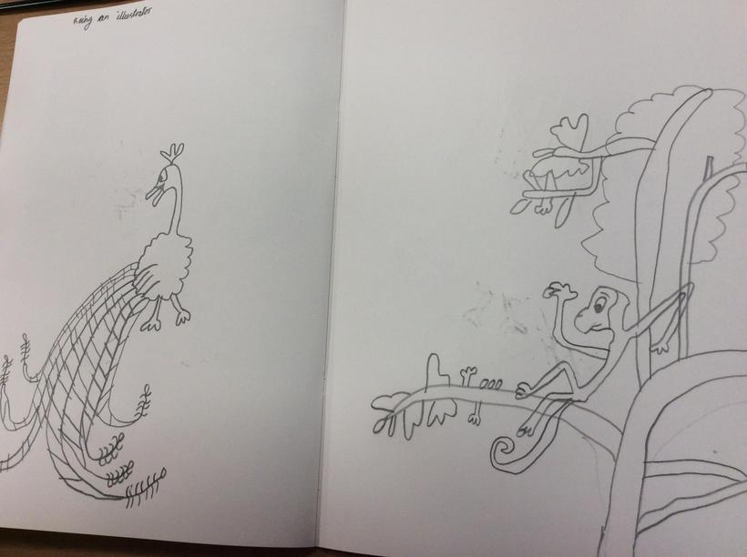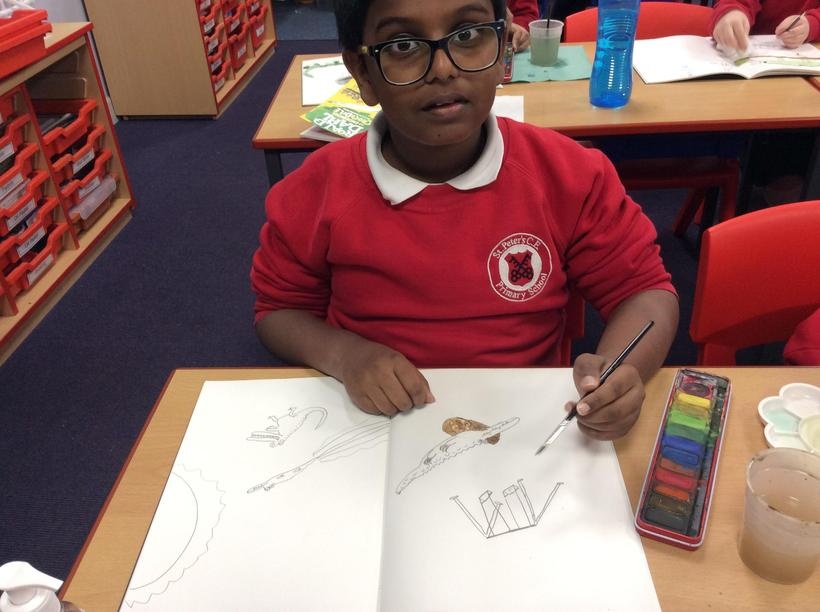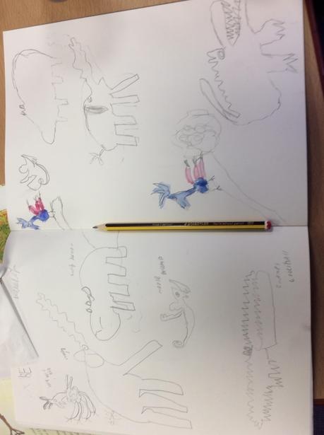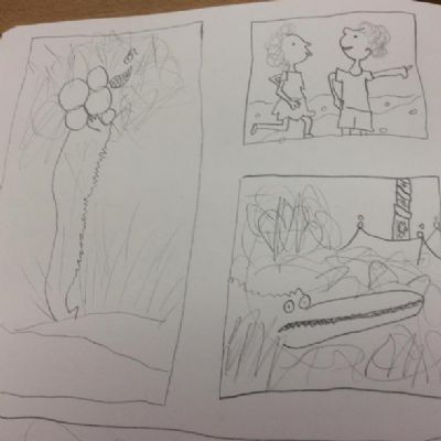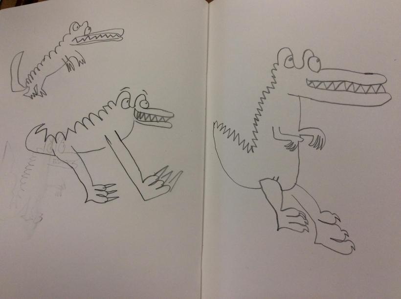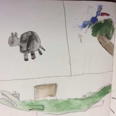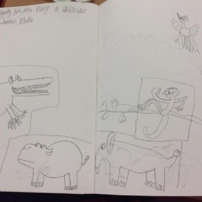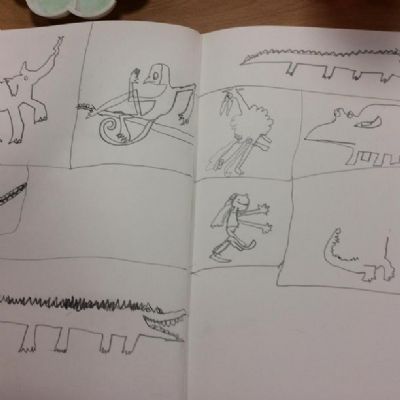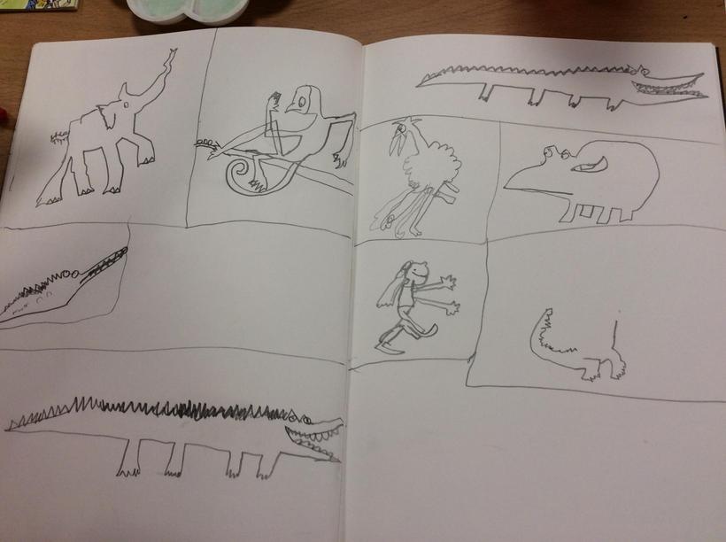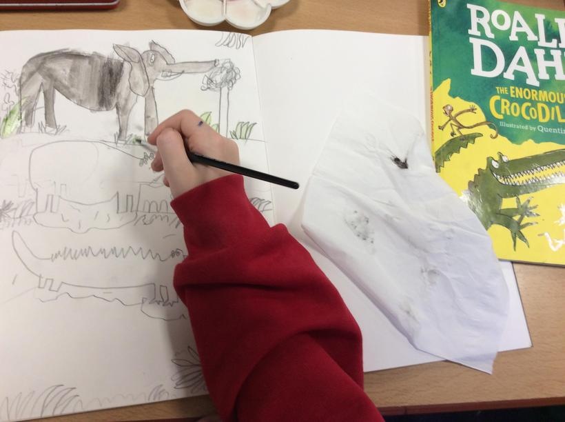 Inspired by Quentin Blake, we have experimented in our sketchbooks drawing and painting the characters from 'The Enormous Crocodile'.
