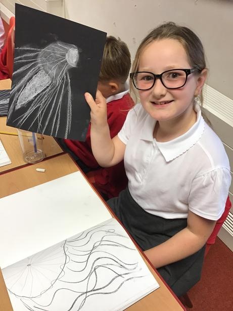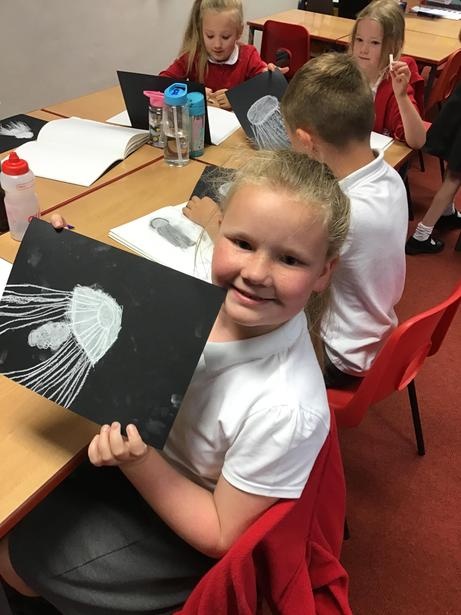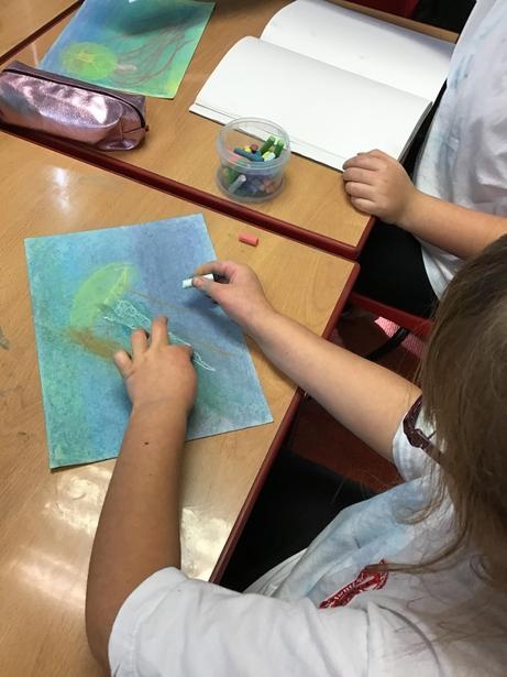 Year 3 and 4 Elder Class - Using mixed media to draw jellyfish focusing on size, line and movement